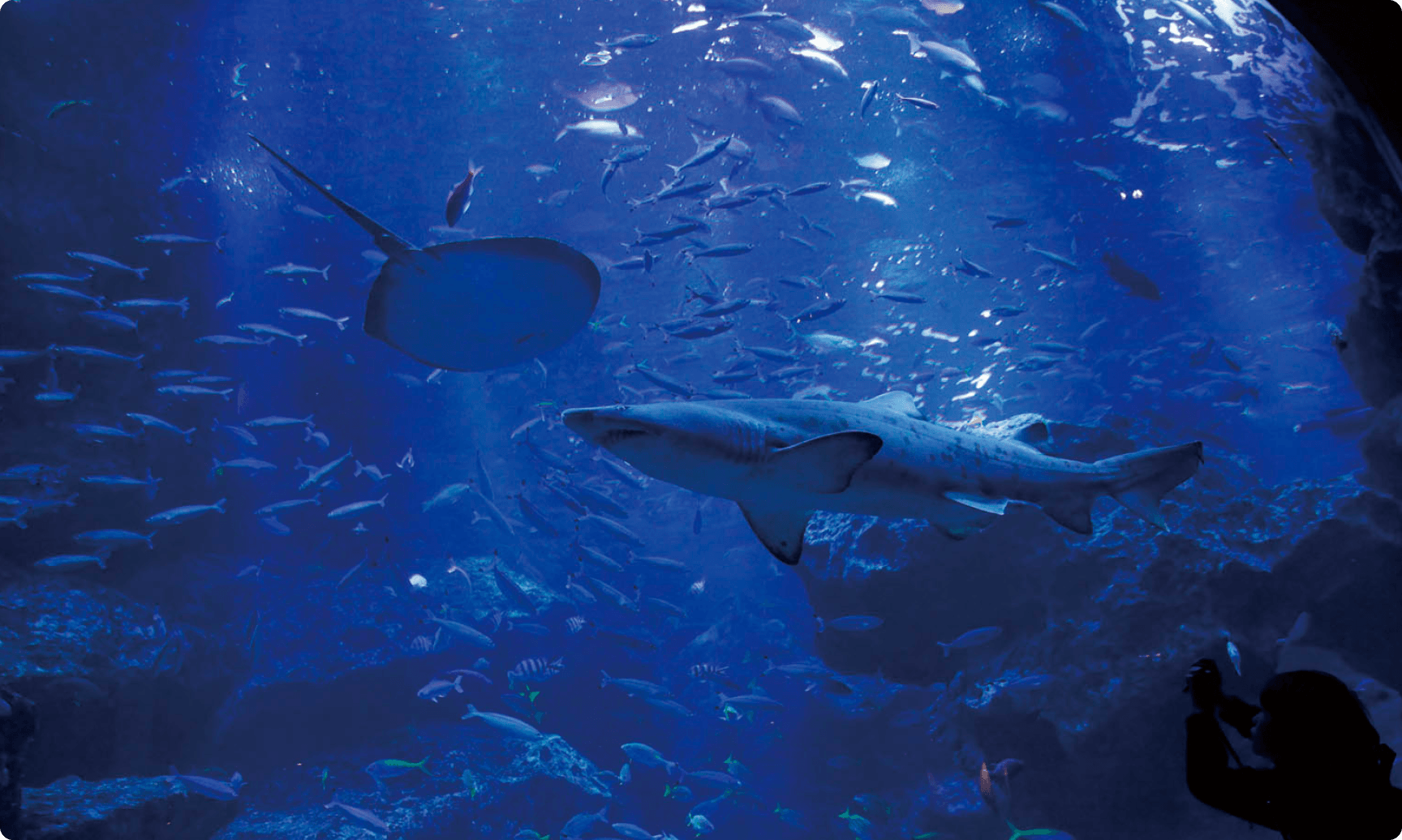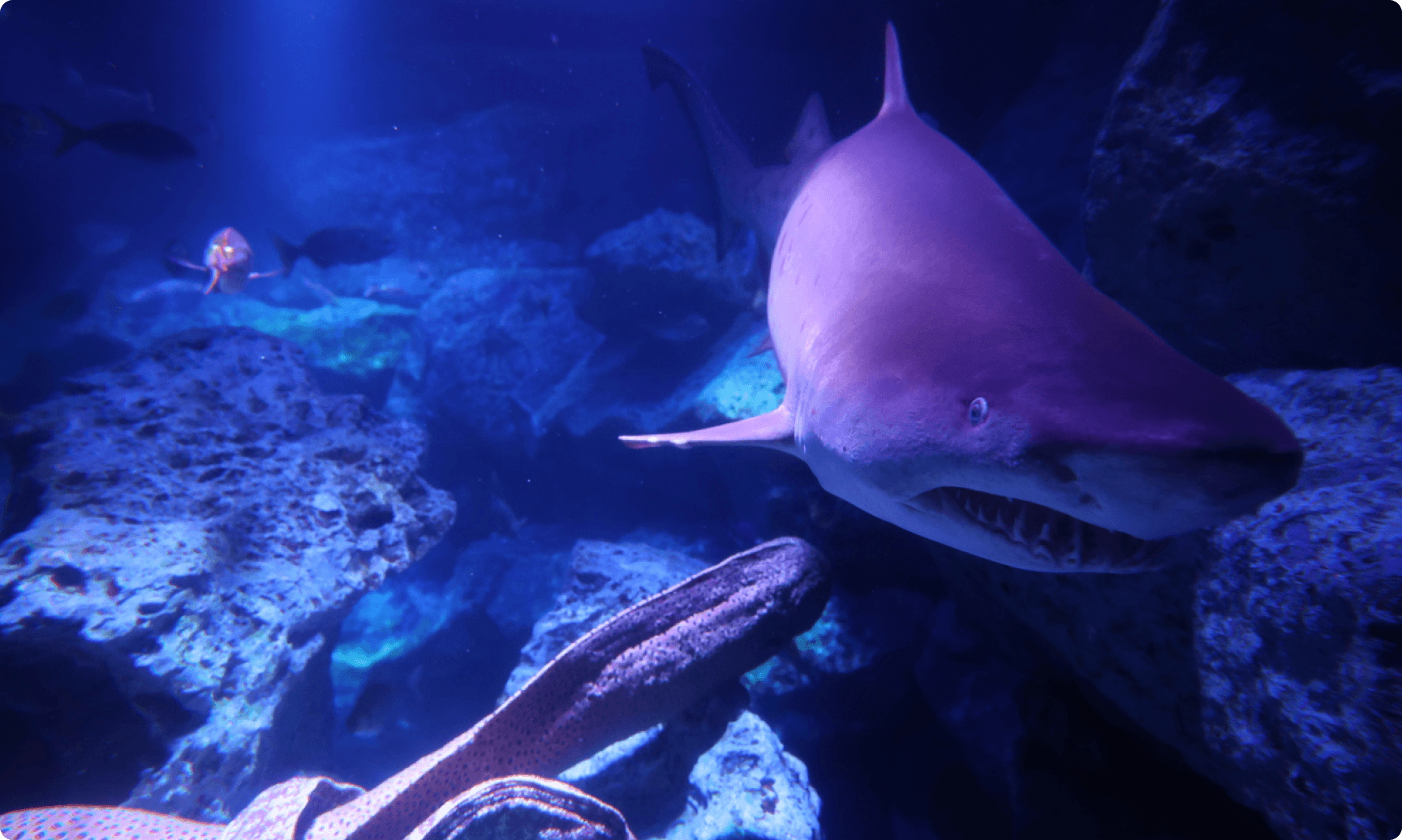小笠原大水槽:シロワニ/マダラエイ/アカマツカサ/シマアジ/ヨスジフエダイ/ノコギリダイ/ミナミイスズミ/ウメイロ/ニセゴイシウツボ/ドクウツボ/ロクセンスズメダイ/マダラハタ/カッポレなど