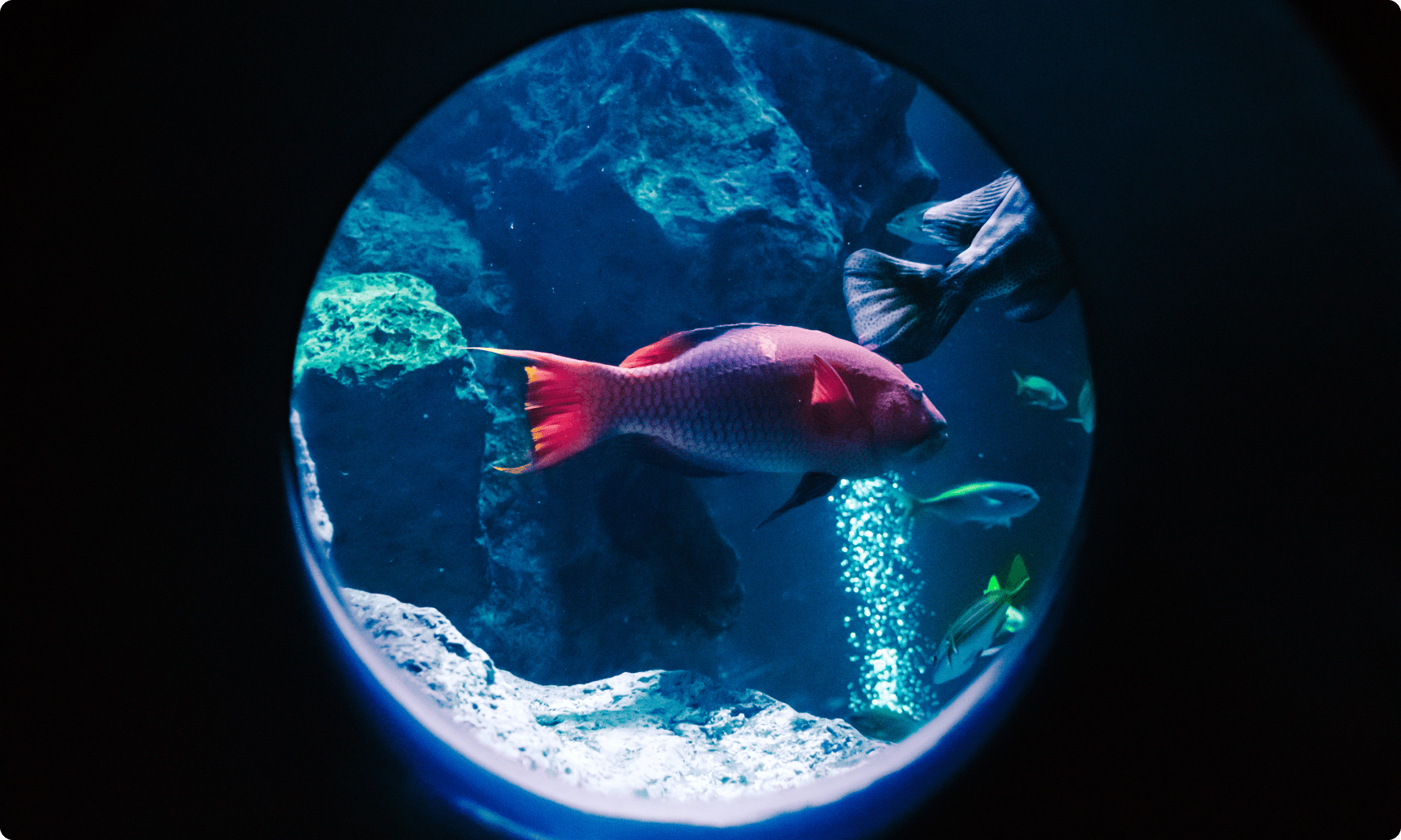小笠原大水槽の裏側には、小さな丸い窓が並んでいます。窓から水槽を覗くと、まるで海の中に潜っているような気分が味わえます。