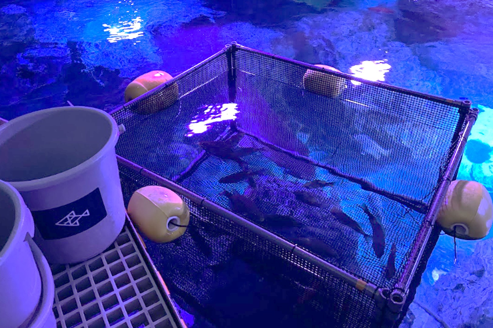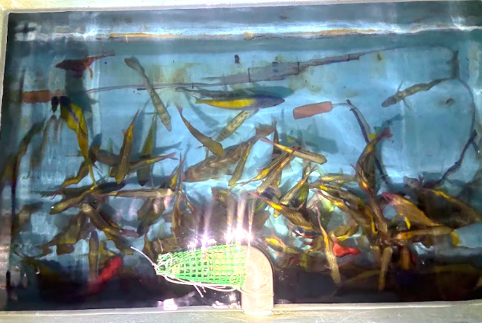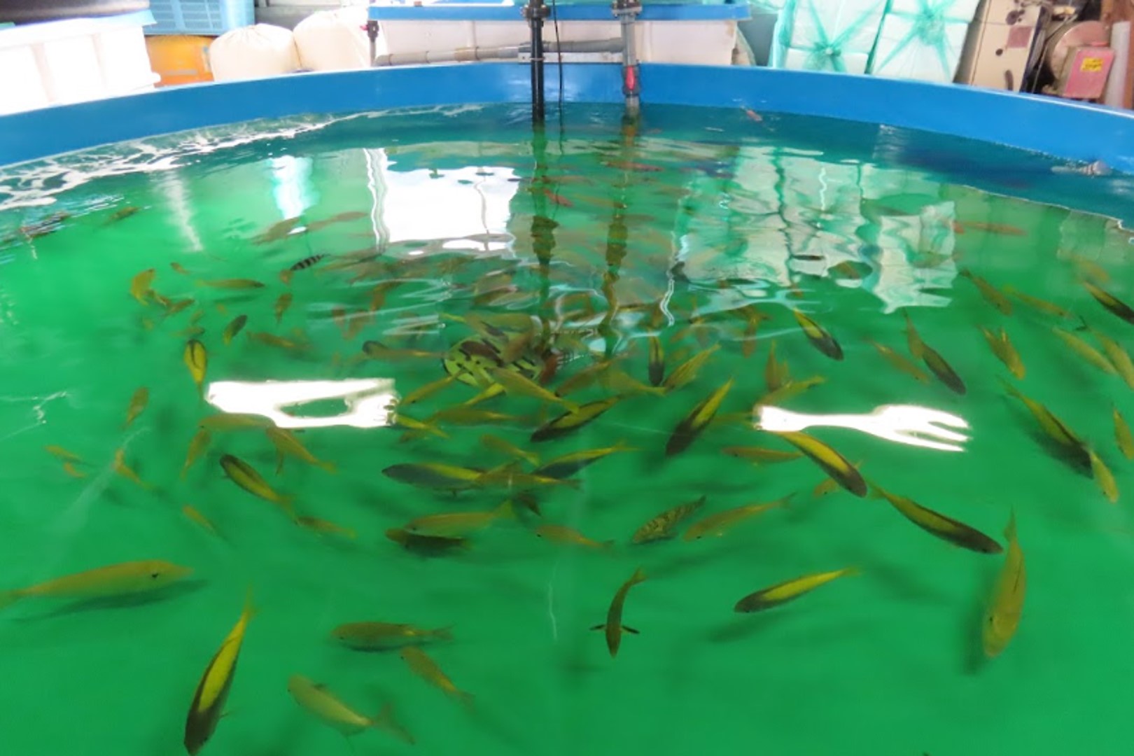 こうして採集した魚たち。水族館へ向かう出発の数日前には、長い輸送中に食べたゴハンを吐いたり、糞をしたりなどで水槽の水が汚れないよう(魚も船酔いのような症状が起きることがあります)、少しだけゴハンを我慢してもらい、1000㎞の大冒険前の準備をします。