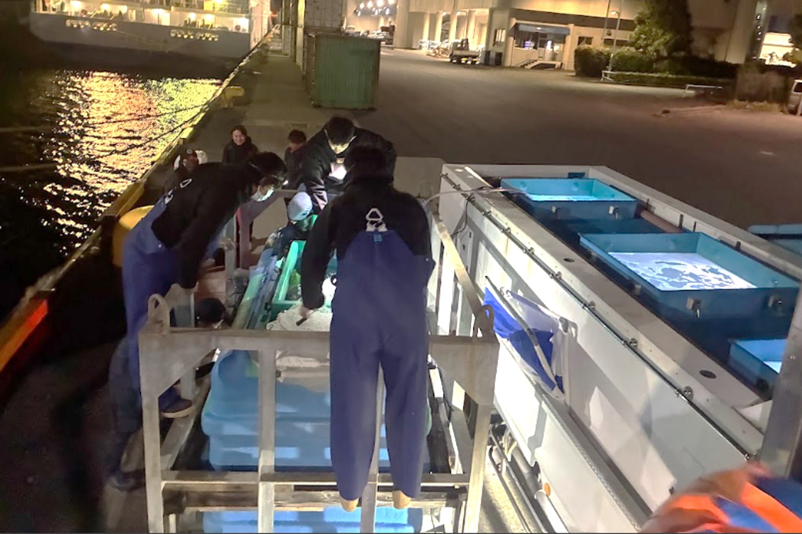 船は2時間遅れの翌日17時になんとか着岸しました。港で待機してくれた飼育スタッフと合流し、活魚トラックとコンテナへ魚を移します。