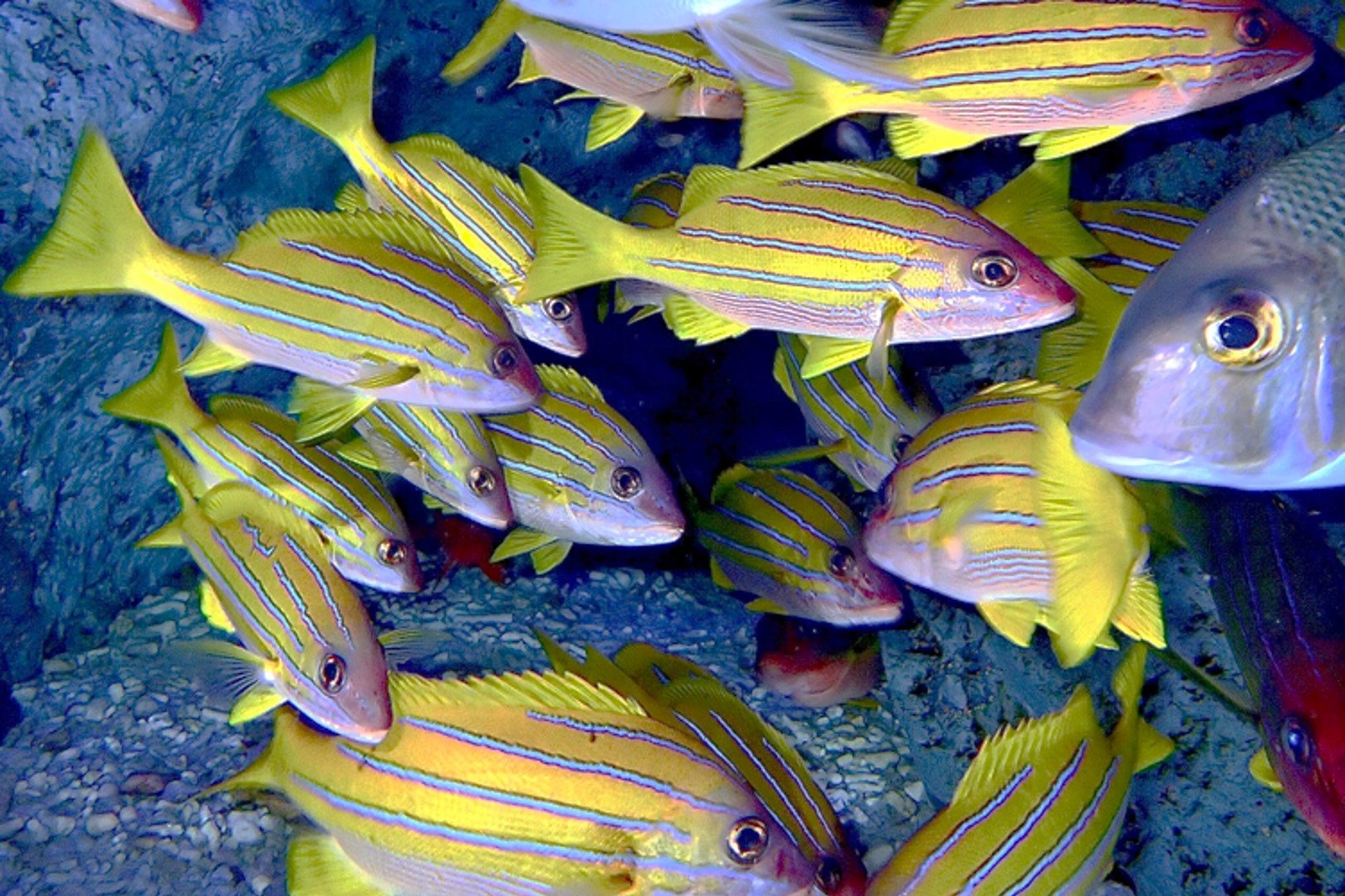 例えばヨスジフエダイは、古参と新入りがそれぞれ大小のサイズ違いで群れています。