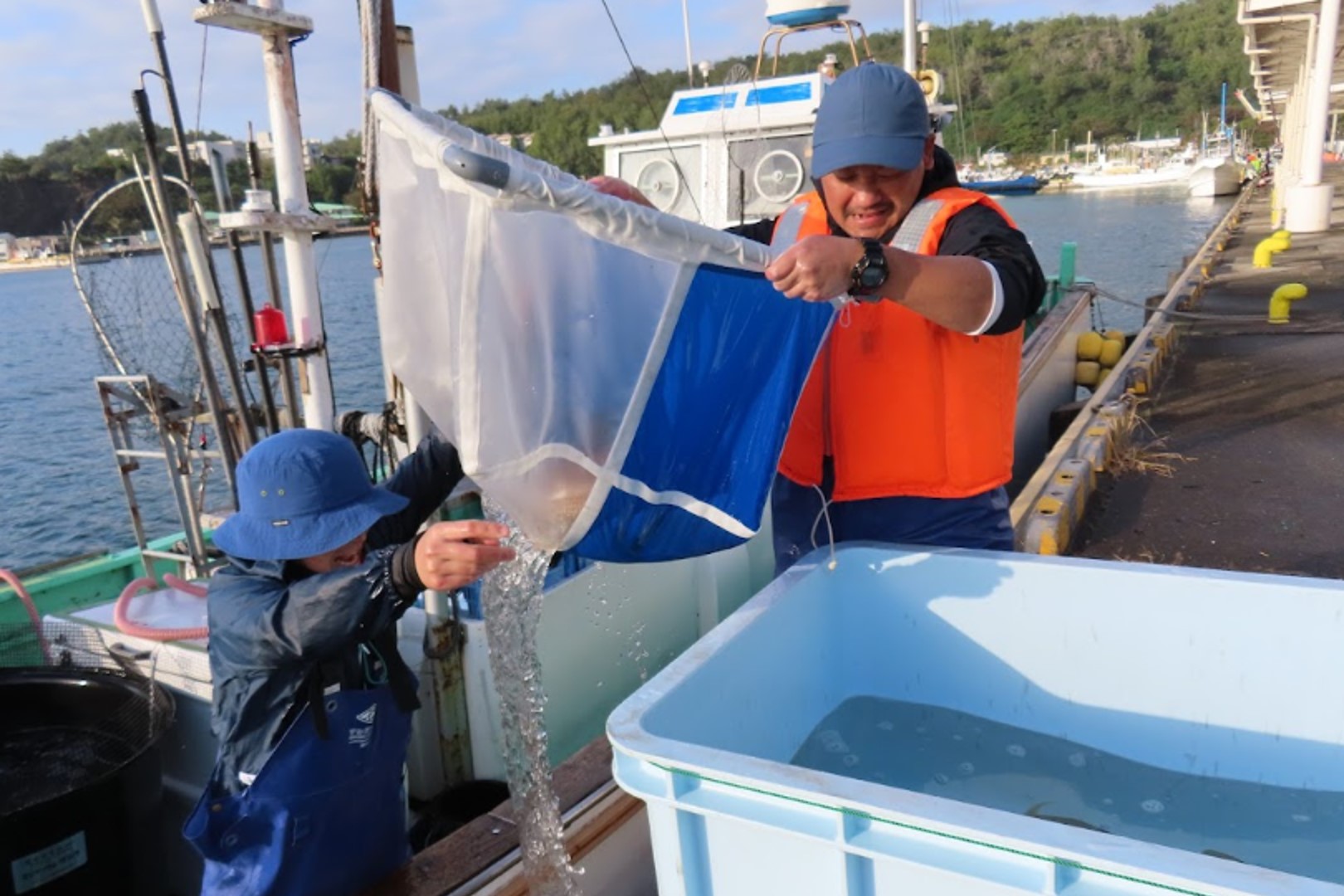 今回は6日間海に出て、毎朝8時30分に出港し、夕方頃に帰港する行程でした。その日に採集した魚たちは、漁協のみなさんにお借りした大きな丸い生け簀に入れます。