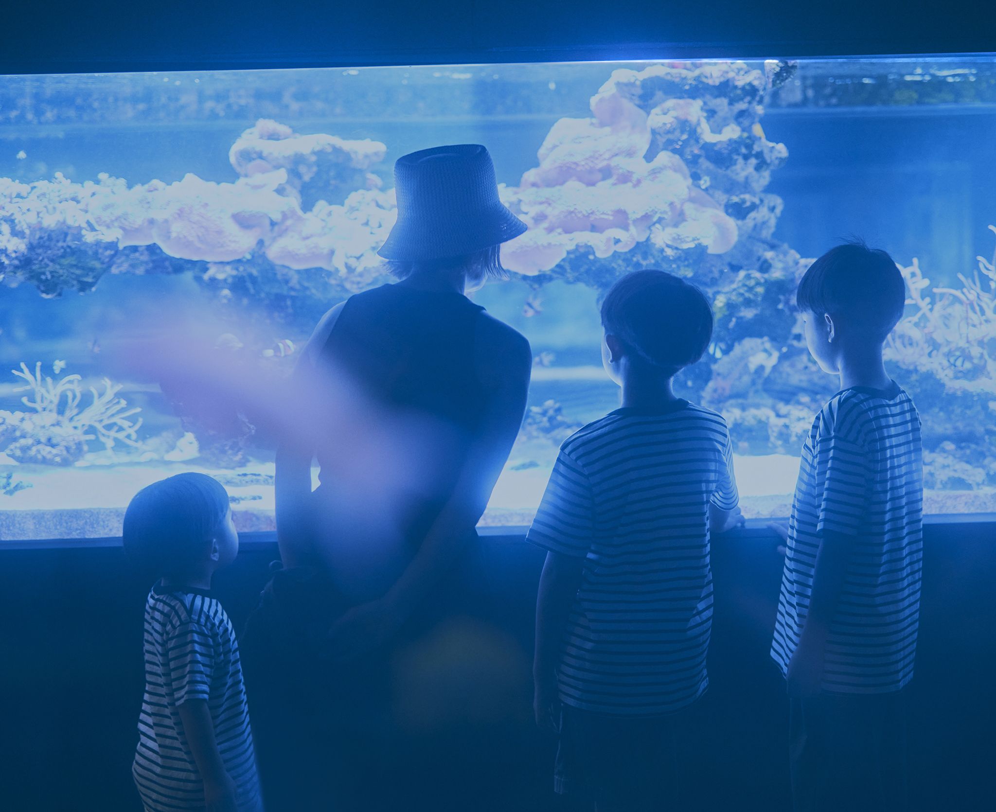 小笠原村の協力により再現した、濃く、深く、どこまでも青く透き通った水槽のボニンブルーを見ていると、水の恵みといきものの命の関係性を身近に感じられます。