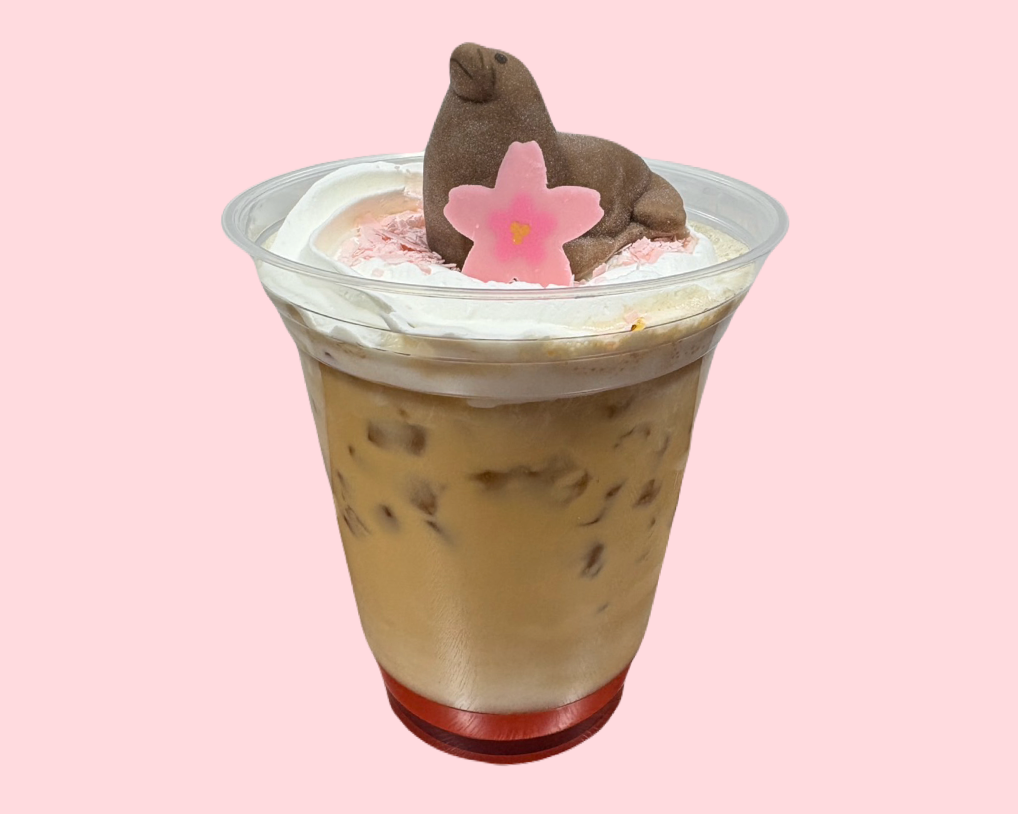 さくらシロップ入りのアイスカフェラテにホイップクリームとオットセイマシュマロ、桜型のチョコをトッピングしました。見た目も味も春を感じられる華やかなドリンクです。
