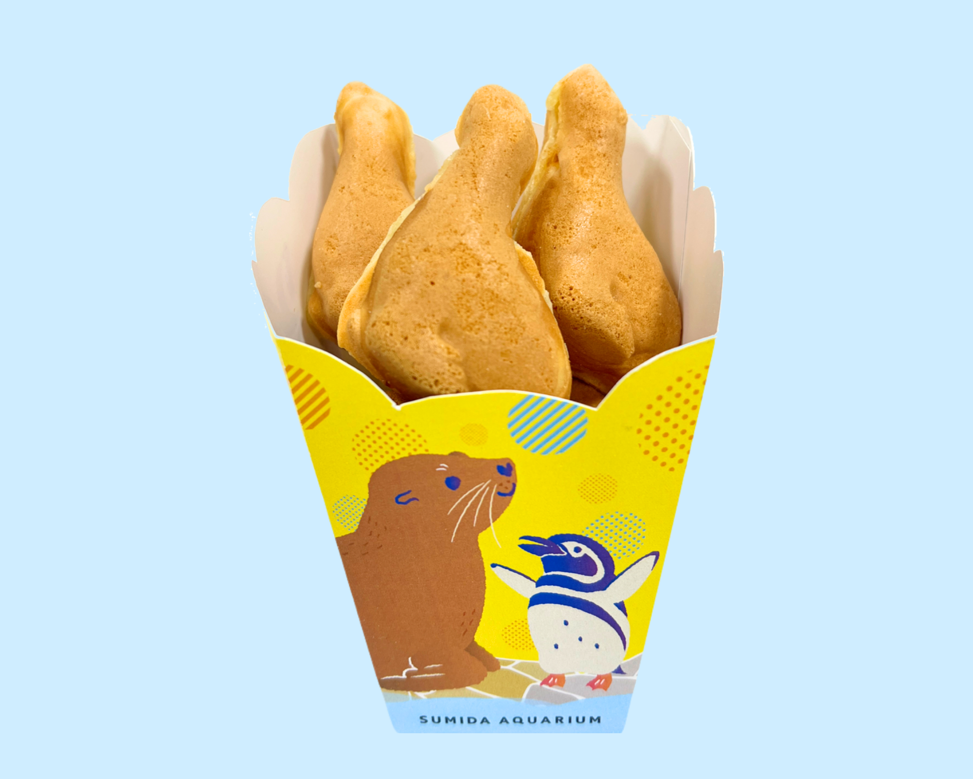 チーズクリーム入りのオットセイ型のミニ人形焼き。すみだ水族館で暮らすオットセイの数と同じ5頭(個)入りです。