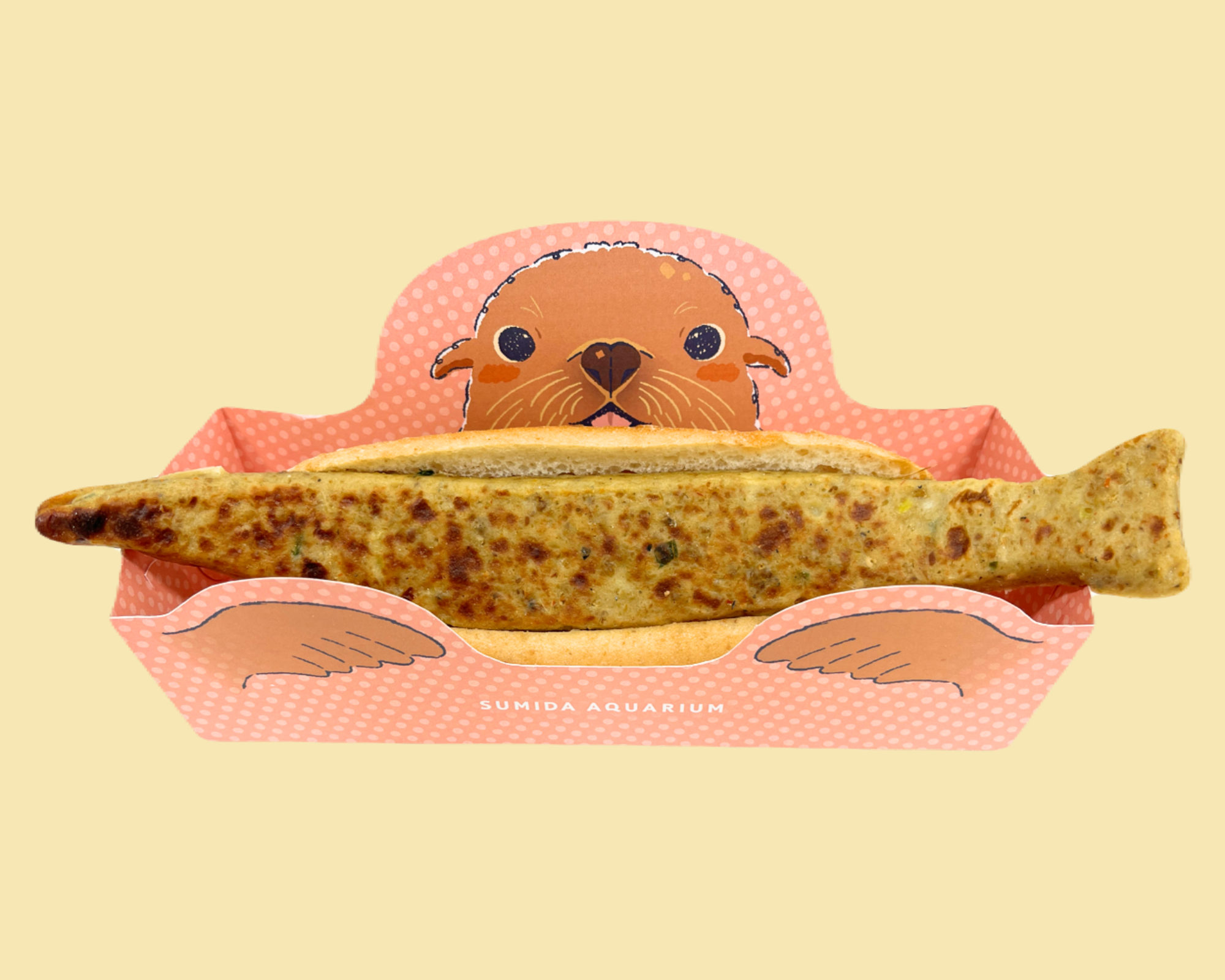 さんまかまぼこを丸々1尾はさんだホットドッグです。すみだ水族館で暮らすオットセイの中で、唯一さんまを頭まで食べられる「アナ」をモチーフにした入れ物でご提供します。アナと一緒に楽しく食べましょう。