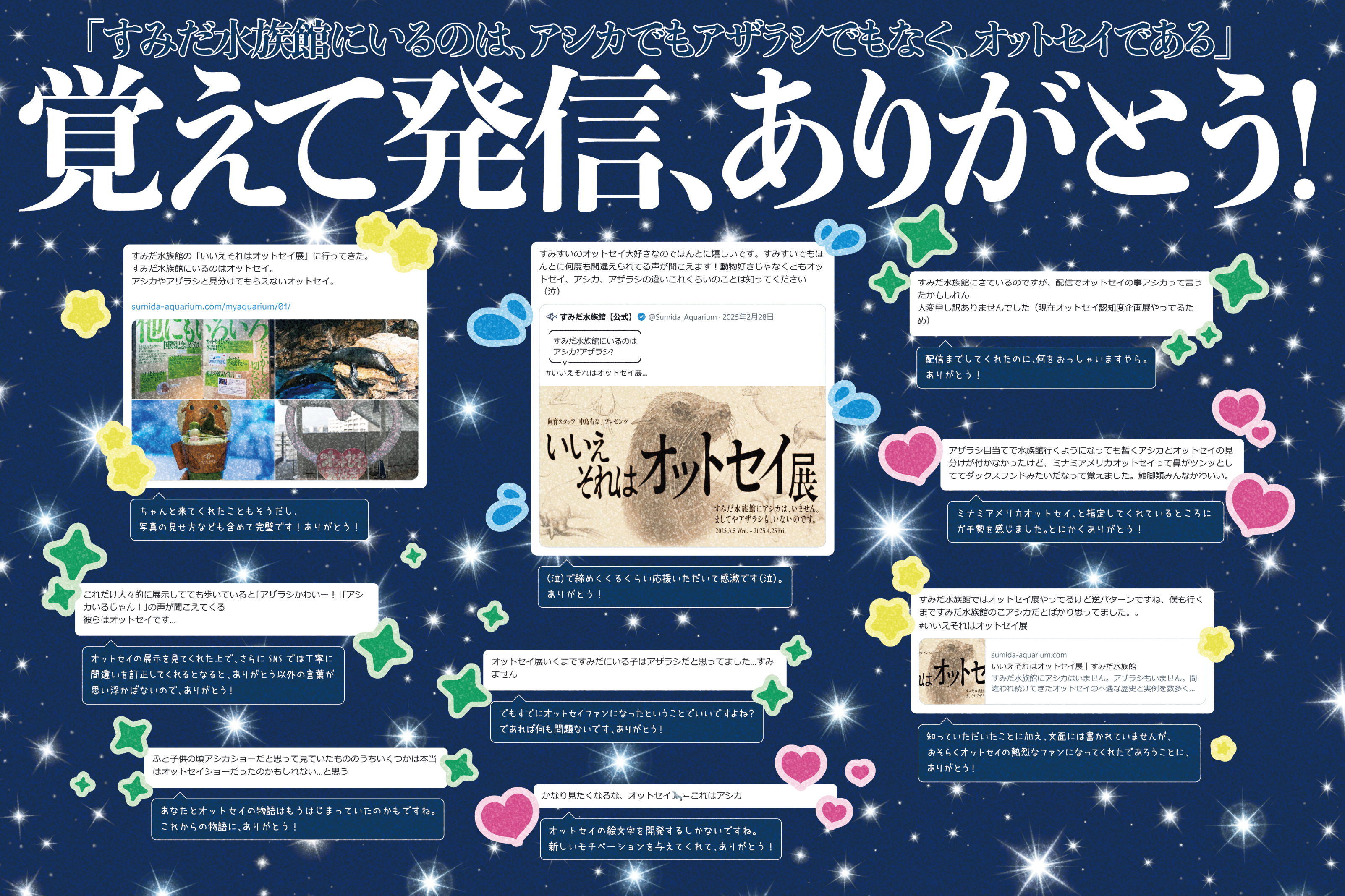 昨年開催したイベント「いいえそれはオットセイ展」で、「すみだ水族館に暮らしているのは、アシカでもアザラシでもなくオットセイである」という事実を覚えてくれて、さらにオットセイの魅力を発信してくれた皆さまのSNS投稿をパネルで紹介し、感謝を伝えます。