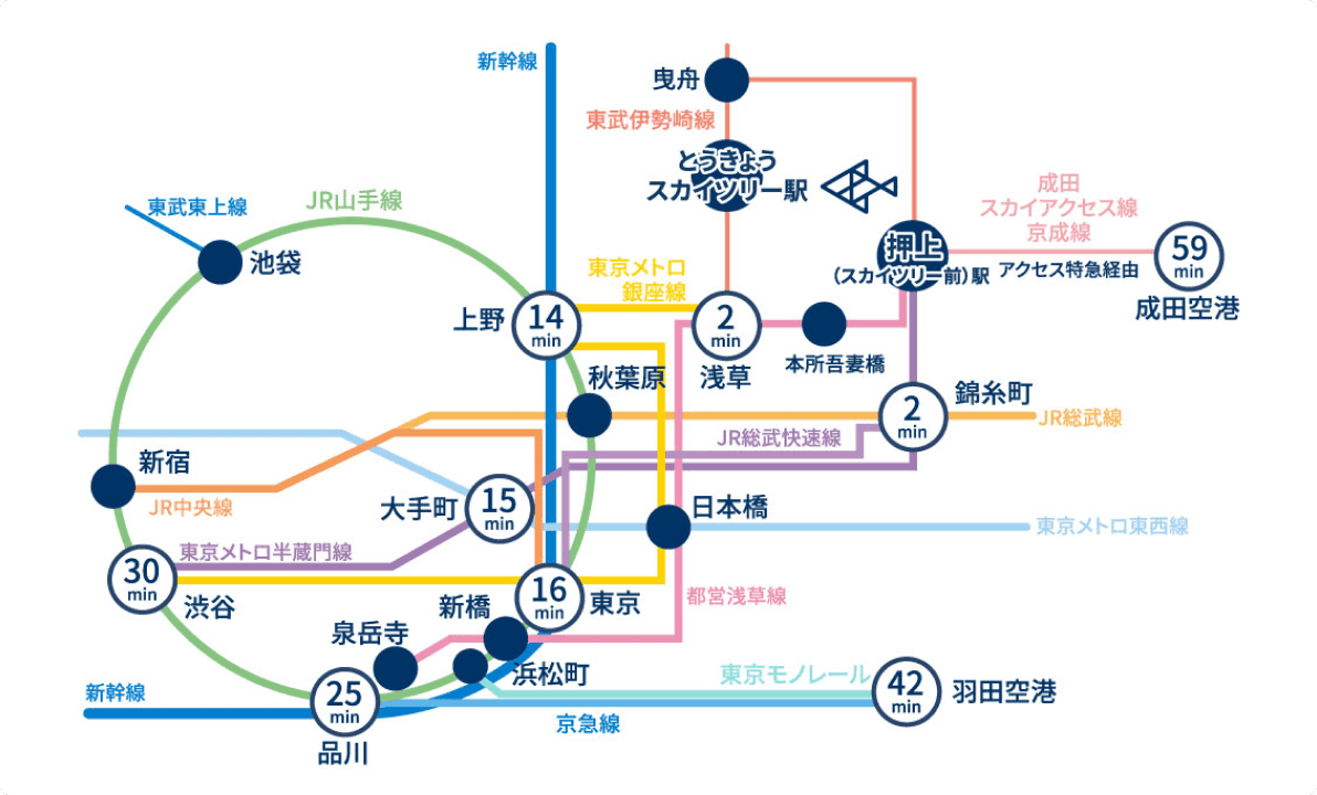 東武スカイツリーライン・東京メトロ半蔵門線・京成押上線・都営地下鉄浅草線「押上(スカイツリー前)」駅 直通徒歩5分
