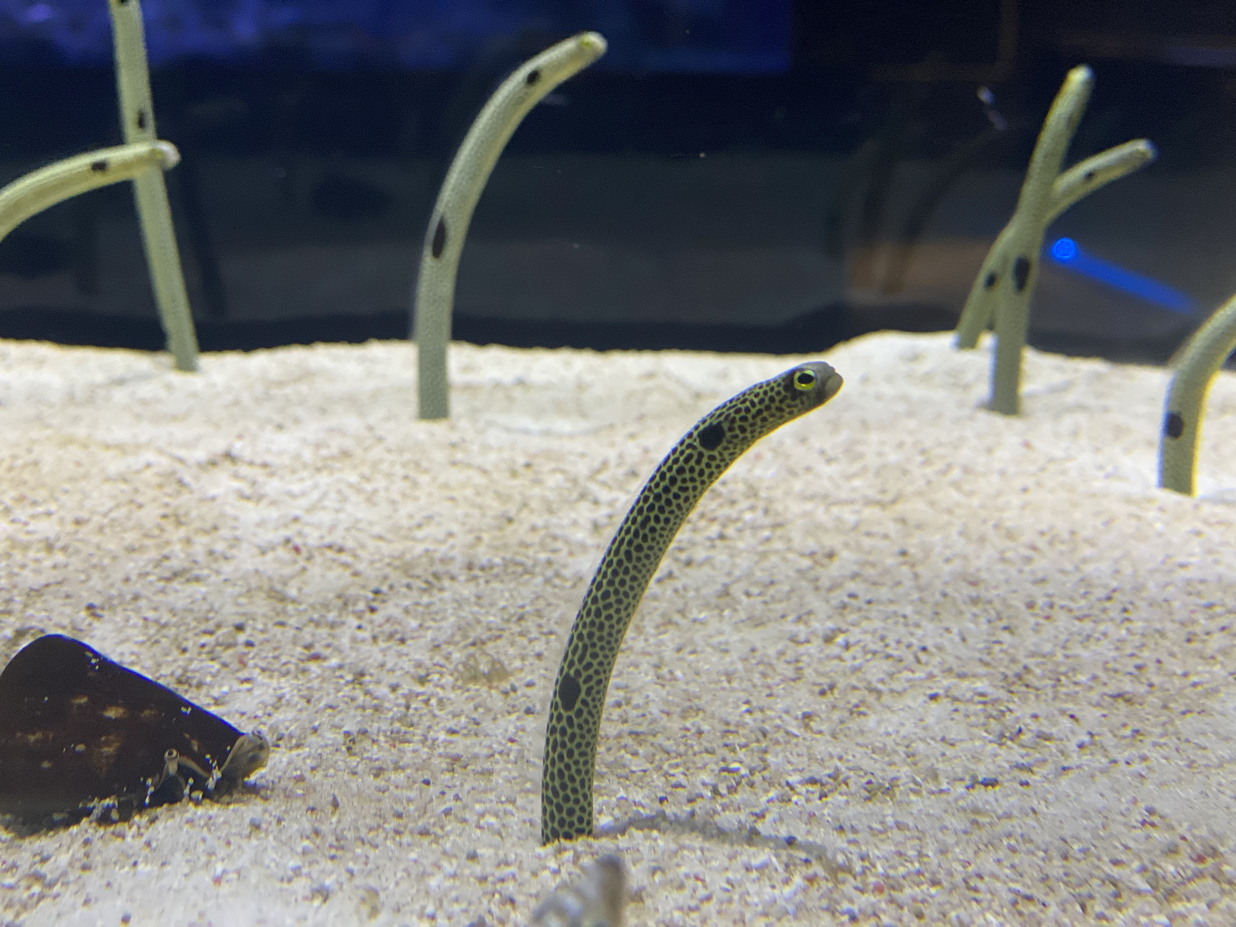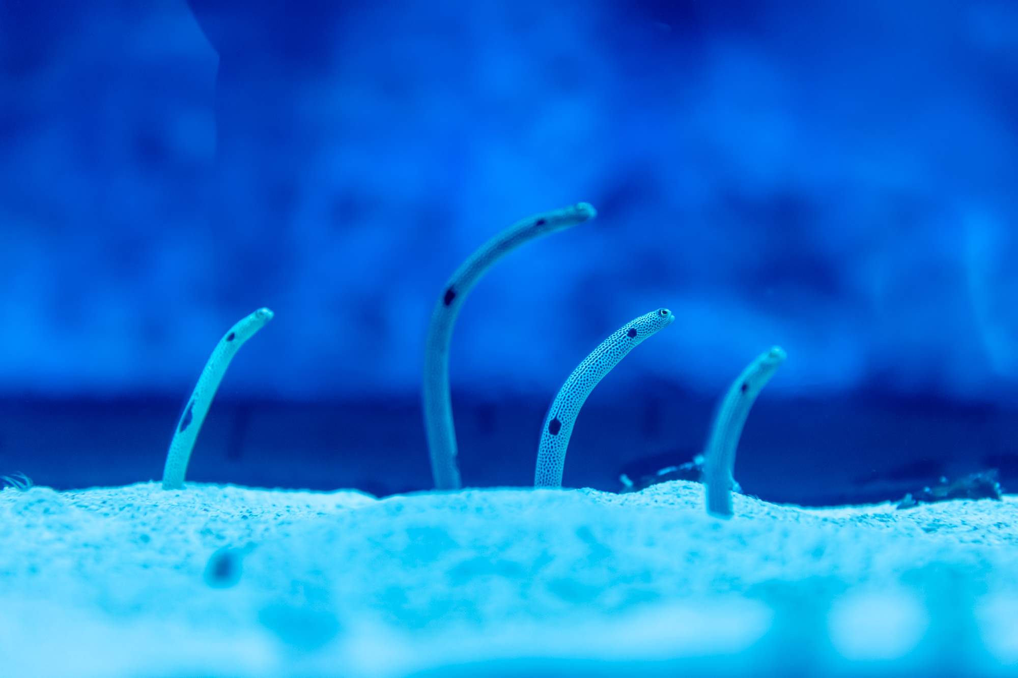 体には細かい白黒の水玉模様に加え、5つの大きな黒丸が特徴的。繁殖生態には謎が多いが、すみだ水族館ではじめて繁殖行動の映像を記録し、これまで謎であった繁殖生態の一部がわかっている。11/11は当館が日本記念日協会に申請・認定された「チンアナゴの日」。日本全国が盛り上がる。