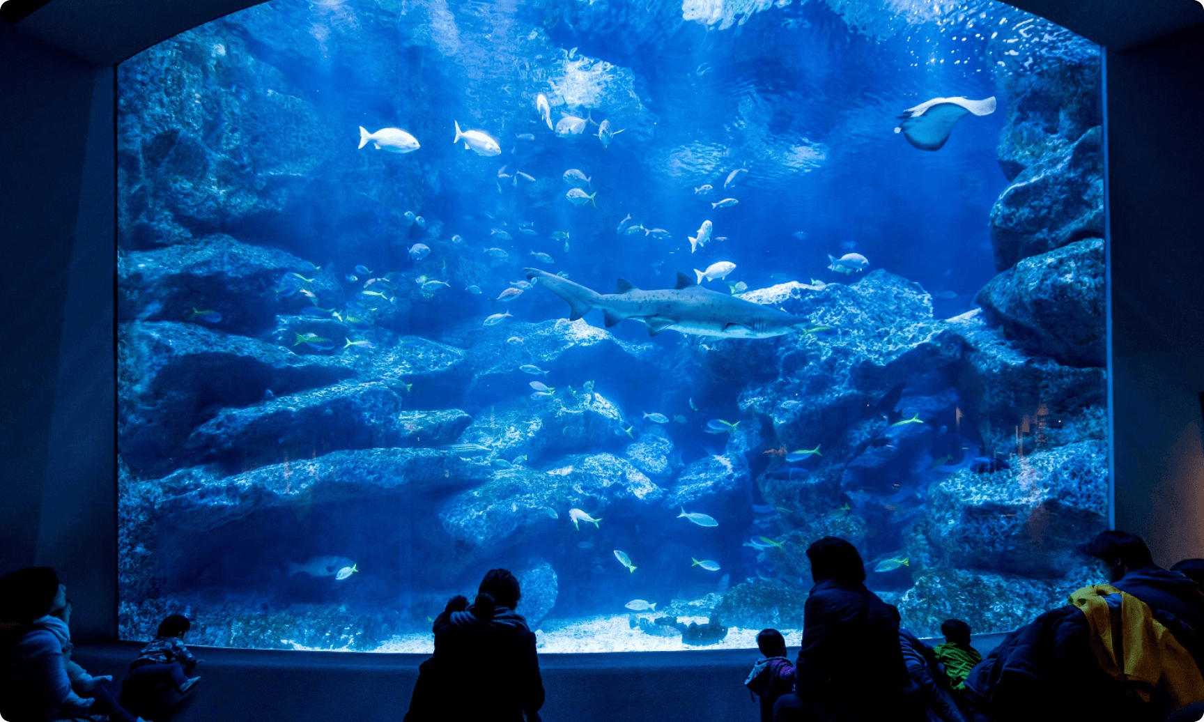 小笠原大水槽:シロワニ/マダラエイ/アカマツカサ/シマアジ/ヨスジフエダイ/ノコギリダイ/ミナミイスズミ/ウメイロ/ニセゴイシウツボ/ドクウツボ/ロクセンスズメダイ/マダラハタ/カッポレなど