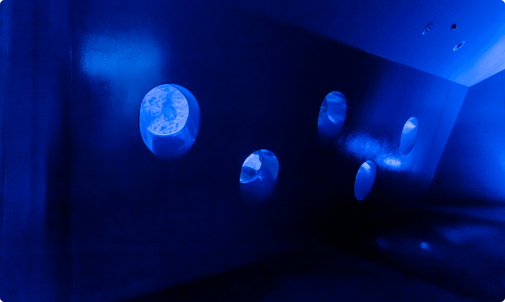 小笠原大水槽の裏側には、小さな丸い窓が並んでいます。窓から水槽を覗くと、まるで海の中に潜っているような気分が味わえます。