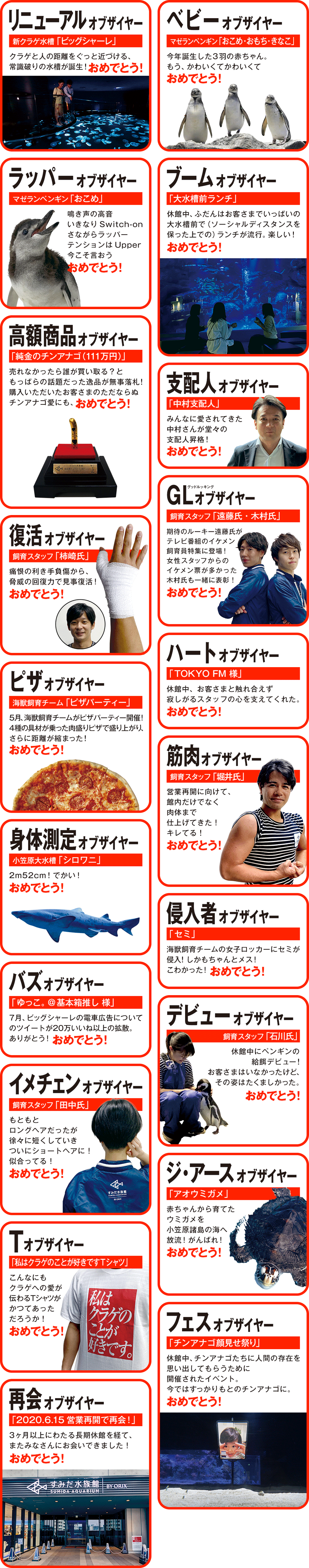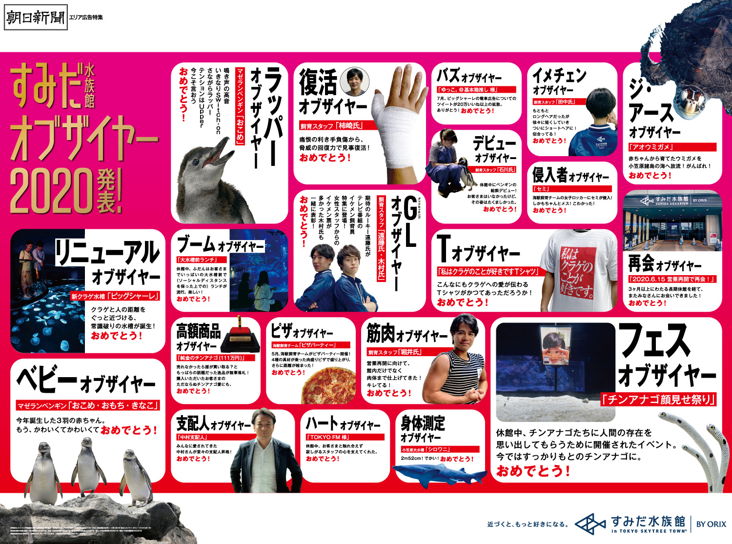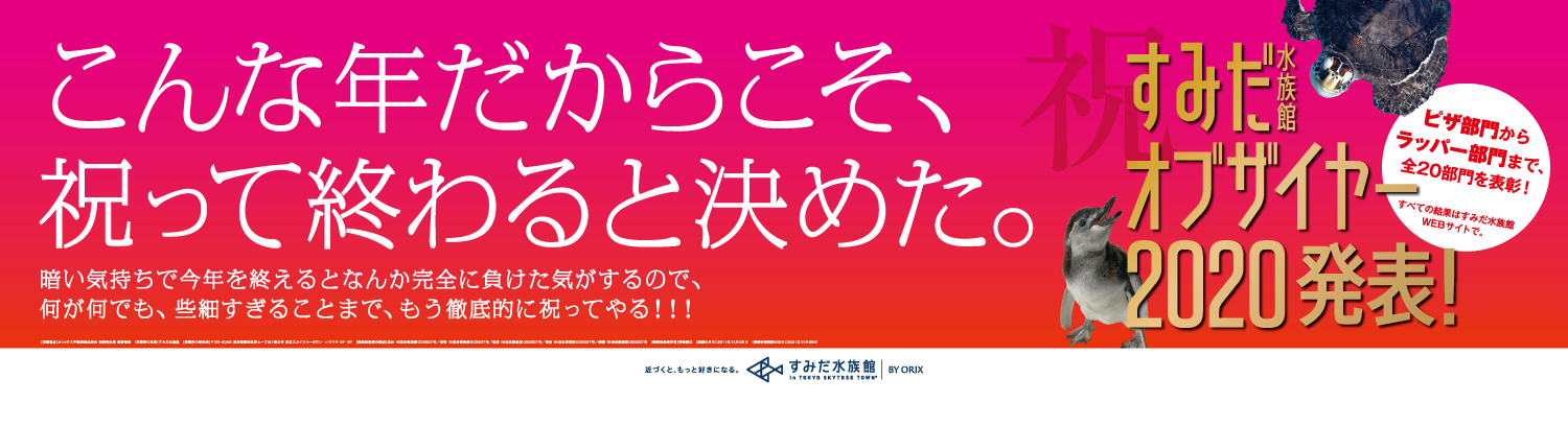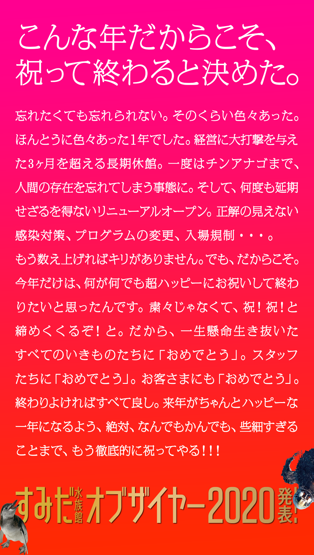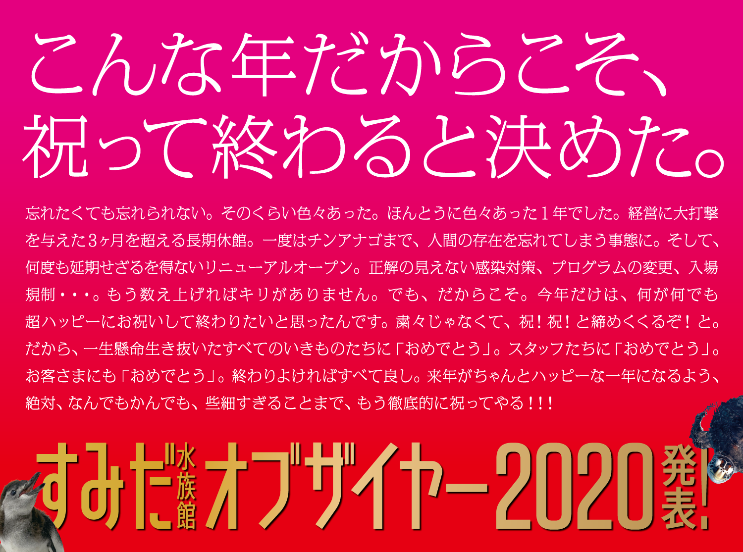 2020年、いろいろなことが起きました。すみだ水族館も、みなさんも、お互い(ほんとに)大変な年だったと思います。でも、だからこそ。2020年をみんなでお祝いして終わりたい。そう思い急遽、表彰することにしました。すみだ水族館オブザイヤー2020、発表いたします!
