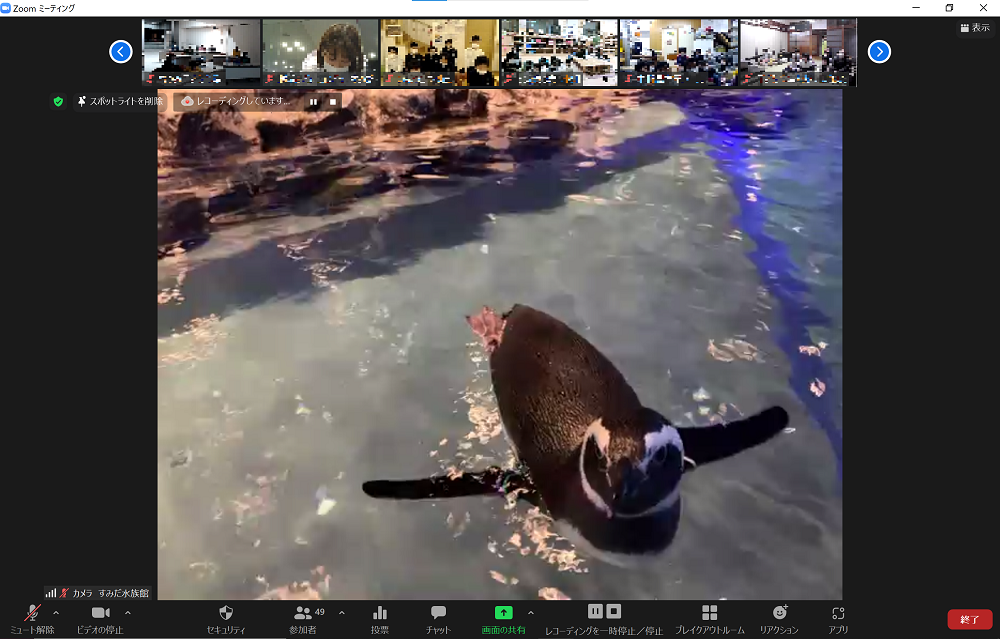 さらに、オットセイの紹介では飼育スタッフの目線でゴハンのようすを配信。普段飼育スタッフしか入ることのできない場所からの視点を見ていただけるのは、オンラインだからこそ可能な体験となりました。そのほかにも、チンアナゴやウミガメ、金魚やペンギンなど、すみだ水族館に暮らすいきものを参加者のみなさんに知ってもらい、楽しんでもらえた見学になりました。