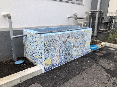 中学校の池の外壁は、アート部が地域やメダカをイメージしたタイルアートを施しました。
