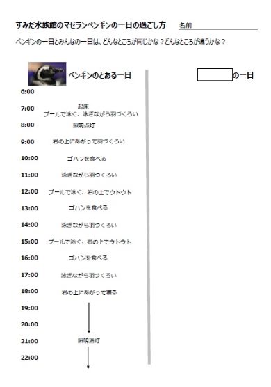 この日、最終的にまとめたいペンギンの一年の暮らしは、一日の暮らしの積み重ねです。なのでペンギンの日々の暮らしを伝えるために、「すみだ水族館のマゼランペンギンの一日の暮らし方」というワークシートを配布しました。