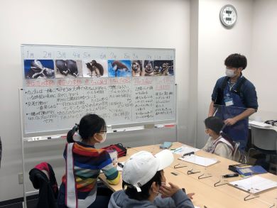今回は、墨田区がペンギンのいる街であるということをPRする目的で事前準備を実施。当日は、8名の子どもたちに来館いただき、普段ペンギンの飼育を担当している飼育スタッフより、マゼランペンギンの暮らしを説明していきました。
