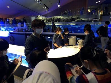 まずは、館内に移動し、ペンギンの飼育作業を見学。ゴハンを準備している「キッチン」や、ペンギンたちのゴハンの時間に向けて、打ち合わせをする飼育スタッフの様子を紹介しました。子どもたちから「ペンギンは何を食べるの?」、「ペンギンはどのように暮らしているの?」と数々の質問を受けました。