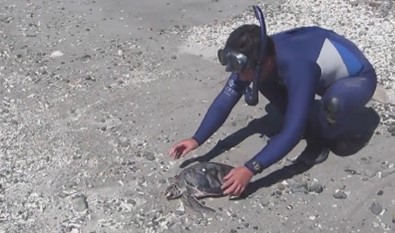 砂浜でそっと手を放すと、ぴたっと止まってしまったかなめ。飼育スタッフがすこしお尻を押してあげると、走り出すように波打ち際へ向かっていき、そのまま波を超え小笠原の海へ!追いかけて泳ぐ様子を記録しようとスタッフも海へ飛び込みますが、ぐんぐん進んでいくかなめに追いつけない・・!あっという間に姿は見えなくなりました。