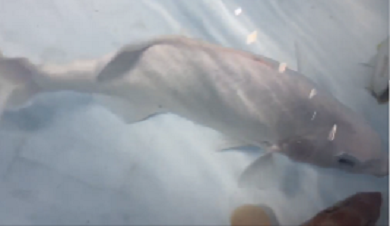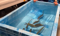 約24時間かけてフェリーが到着すると、今度は港からすみだ水族館へ移動するために活魚運搬車の水槽へ。横から覗く魚たちは、みんな元気!しかし、長旅で疲れているであろう魚たちですので、ここからはスピード勝負。水族館からも飼育スタッフが合流し6人がかりで1匹1匹のようすをチェックし、傷つけないように注意を払いながら急いで移動します。そして活魚車に収容後は速やかにすみだ水族館へ向かいました。