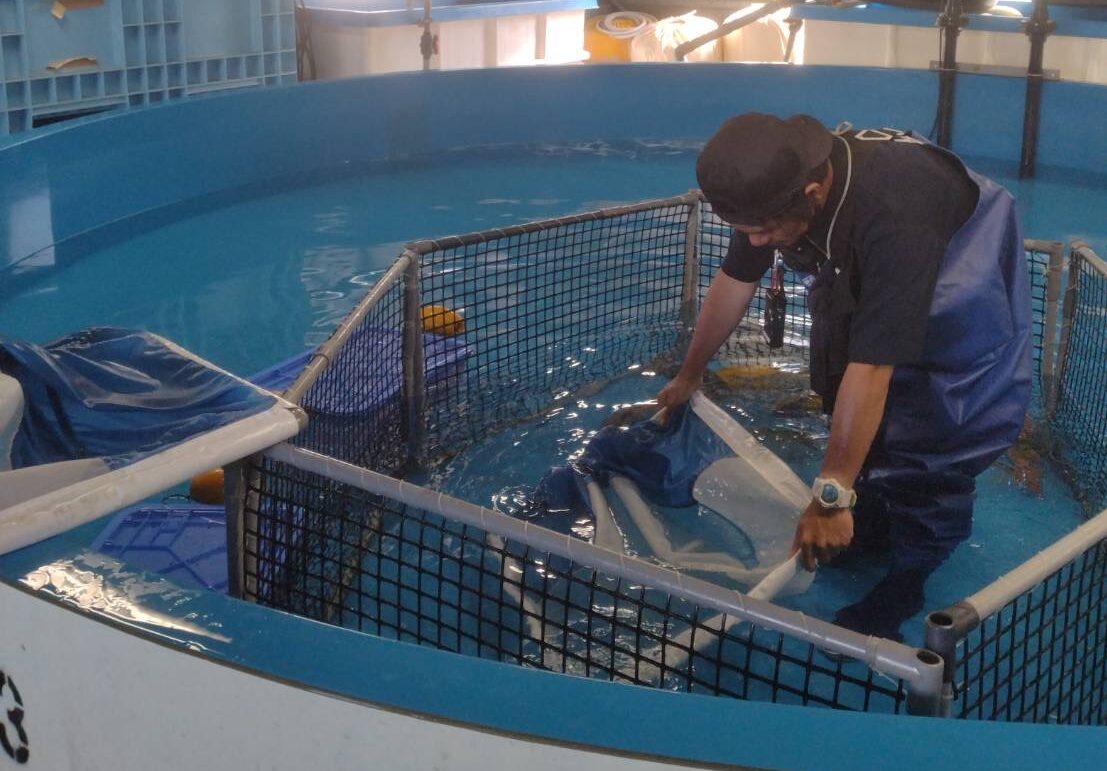 すみだ水族館へ到着すると、今度は飼育スタッフたち総出で小笠原大水槽へ移す作業を行います。小笠原村を発ってから、この時点でおよそ26時間。みんな元気に、無事に大水槽へ移せるように時間との戦いです。活魚車の水槽から、大水槽へ向かうための移動式のコンテナへ移し、急いで移動!コンテナが水槽の近くへ運びこまれると、リレー方式で大水槽の中へ。初めての環境でも魚たちが安心して群れていられるよう、移し替える際にはまずは網で仕切った囲いへ全て移します。囲いへの収容後は、落ち着いているかどうか、しばらく経過を観察します。