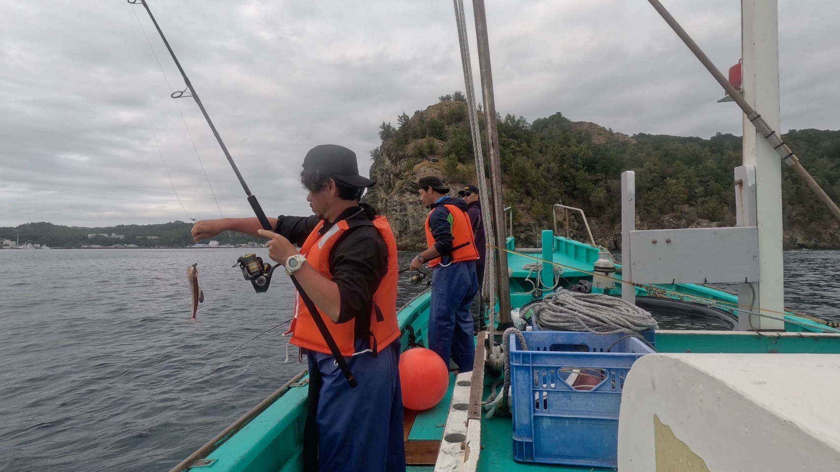 魚たちを採集する際は釣り竿を使用します。網を使ってしまうと魚の体表に傷がつくことも多いため、約200匹もの魚たちを、1匹ずつ丁寧に釣り上げます。水深によって、釣り上げると気圧の変化で「浮袋」と呼ばれる部分の空気が膨張して沈むことができなくなってしまうことがあり、そのようなときには船上にて速やかに浮袋の空気を抜いてあげるなどのケアも行います。
