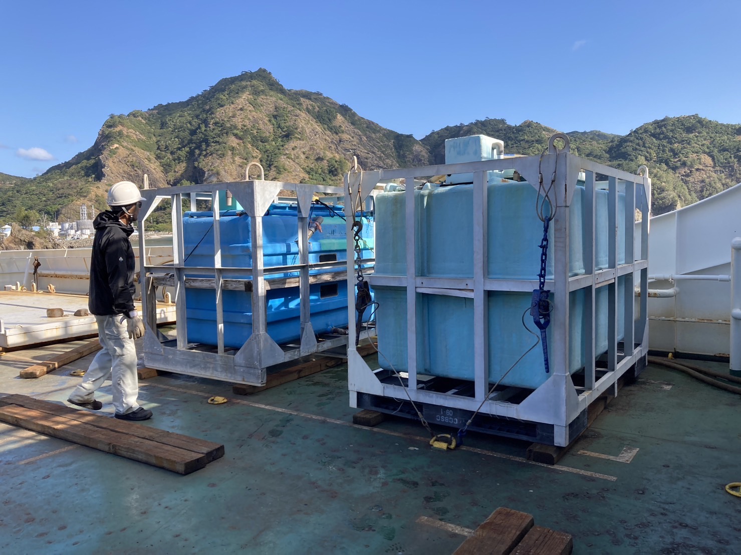 採集した魚たちは現地で大きな水槽に移し、水族館でのお世話と同様に、ゴハンをあげたり掃除をしたり、しばらく健康管理を行います。そして小笠原村から出発する日に、移動用の水槽へ移され、いよいよフェリーへ。同じ東京都なのに24時間かかる渡航の間、数時間おきに水槽にいる魚たちようすや水温をチェックし、確認しながら約1,000kmの海を渡ります。