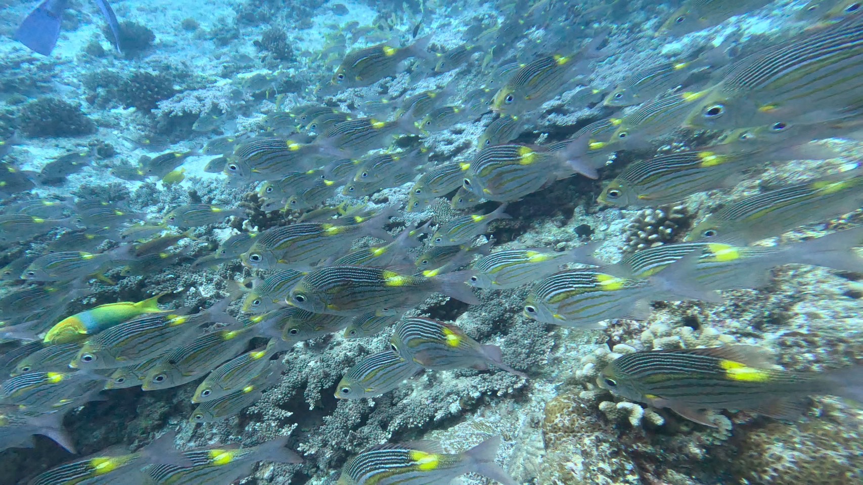 小笠原諸島の海では、たくさんの魚たちが暮らしています。今回の目標は、まず、他所では滅多にお目にかかれませんが、なぜか小笠原諸島では色彩変異が多く出現する「ミナミイスズミ」という魚。通常はグレーがかった色をしていますが、鮮やかな黄色の個体が群れの中にかなりの確率で混じって暮らしており、小笠原諸島の海を特徴づける種類です。他、小笠原諸島の海でもたくさんみられる「ノコギリダイ」の群れや「カッポレ」などの大型魚です。