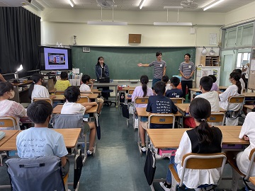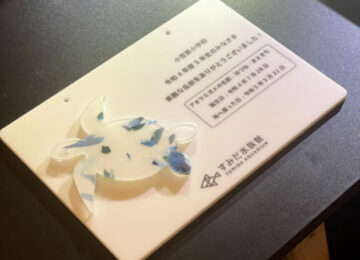 授業の最後に、「はつね」と「まえきち」のお名前を考えてくださったお礼にメッセージプレートをお渡ししました。ウミガメのプレートの素材の一部は、小笠原諸島で先日回収した海洋ゴミを再利用しています。このプレートを飾っていただくことで、ウミガメが産卵する小笠原の海岸を大切に思う気持ちや、そして「広報大使」として、遠く離れたすみだ水族館を通じて、小笠原の魅力が伝えられたことを実感してもらえれば、という想いも込めました。