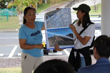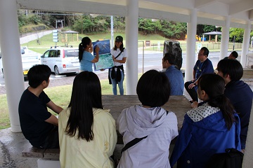 ビーチクリーン当日、清掃活動を始める前に、小笠原海洋島研究会(BOISS)の猪村さんに講義をしていただきました。BOISSは、島の自然と島民が共生できる豊かな島の実現に寄与することを目的に活動をしているNPO法人です。