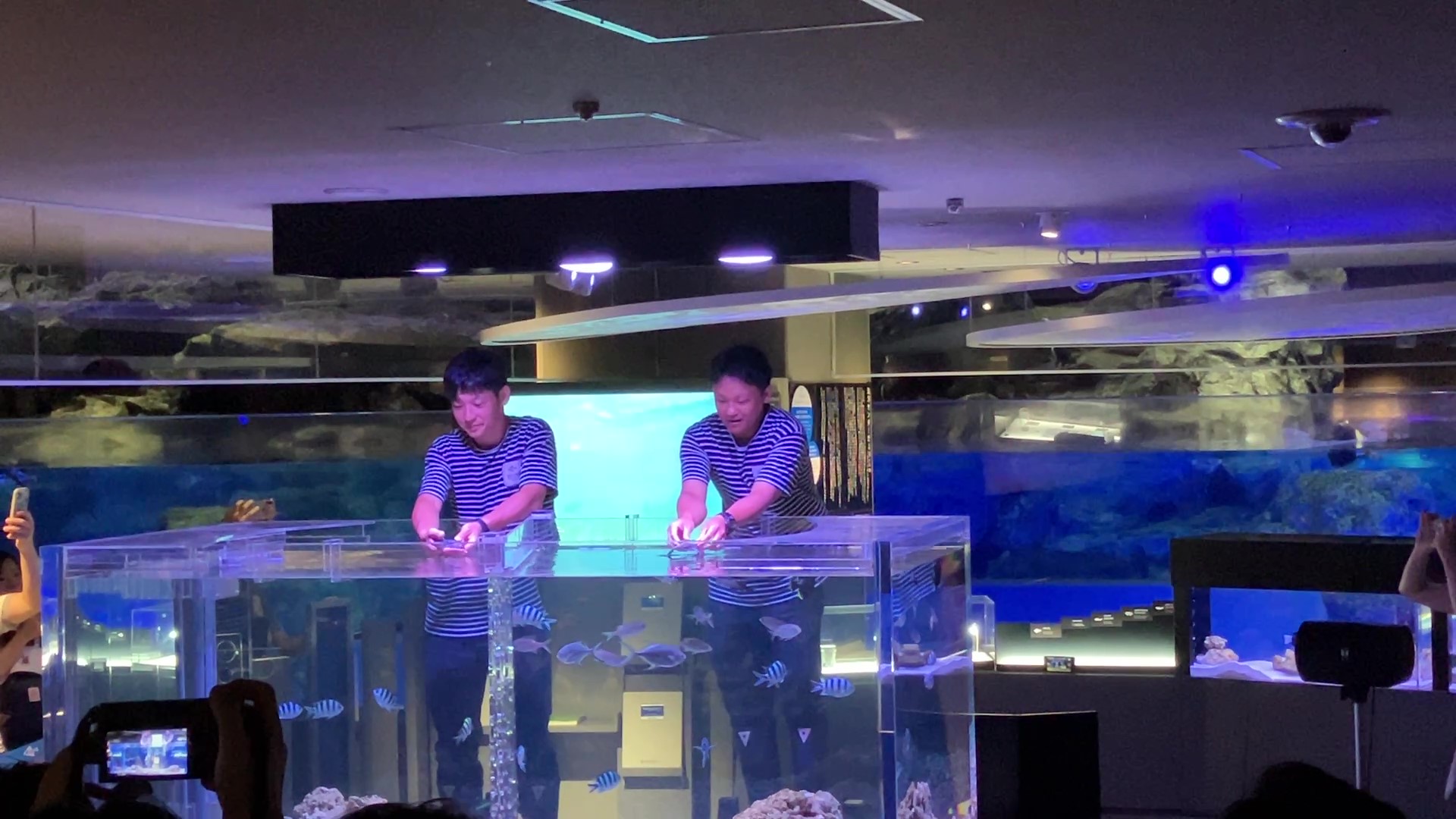 お披露目会で「ハート」と「ロック」が水槽にはじめて入るようす
