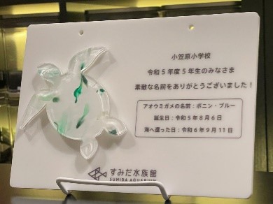 令和5年度に小笠原小学校5年生だったみなさんには「ボニン」と「ブルー」という素敵な名前を付けていただきましたが、2頭の名前を通じて「小笠原のどこまでも透きとおる深く青い海の色、ボニンブルー」について、多くの方に知っていただくことができました。また、交流のお礼に、海浜清掃活動で回収したプラスチックをアップサイクルしたプレートも寄贈しています。今年度のプレートには、「ボニン」と「ブルー」の誕生日や海へ還った日を記しました。小学校を卒業した後でもプレートを見返すことで、水族館で共にふるさとの自然を伝えたことを思い出すとともに、その自然を大切にする心をいつまでも忘れずにいてほしいと願っています。