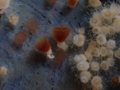 プラヌラがどこかへ定着すると、イソギンチャクのような形をしたポリプと呼ばれる姿に変わります。ポリプは元気に育つと分裂し、クローンをつくってどんどん殖えます(無性生殖)。