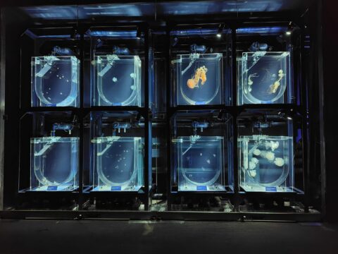 すみだ水族館では2012年の開業時からクラゲの飼育に取り組んできました。クラゲ飼育は本当に挑戦の連続で、開業時はそもそも人工海水で大規模にクラゲの飼育が出来るのか大きな挑戦でした。しかし、1年2年とクラゲを飼育し、様々なことに挑戦をしていくうちにクラゲの気持ちが少しはわかるようになりました。今回は当館のクラゲ展示と繁殖について紹介します。(展示飼育チーム 百崎 孝男)