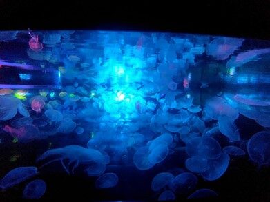 この水槽、意外だったのが赤ちゃんのフォトスポットとして人気だということです。ベビーカーを水槽の下に差し込み、水槽からの照明で赤ちゃんが照らされ、絶妙なアングルで撮影できます。赤ちゃんもクラゲに癒されてくれるといいなと思います。