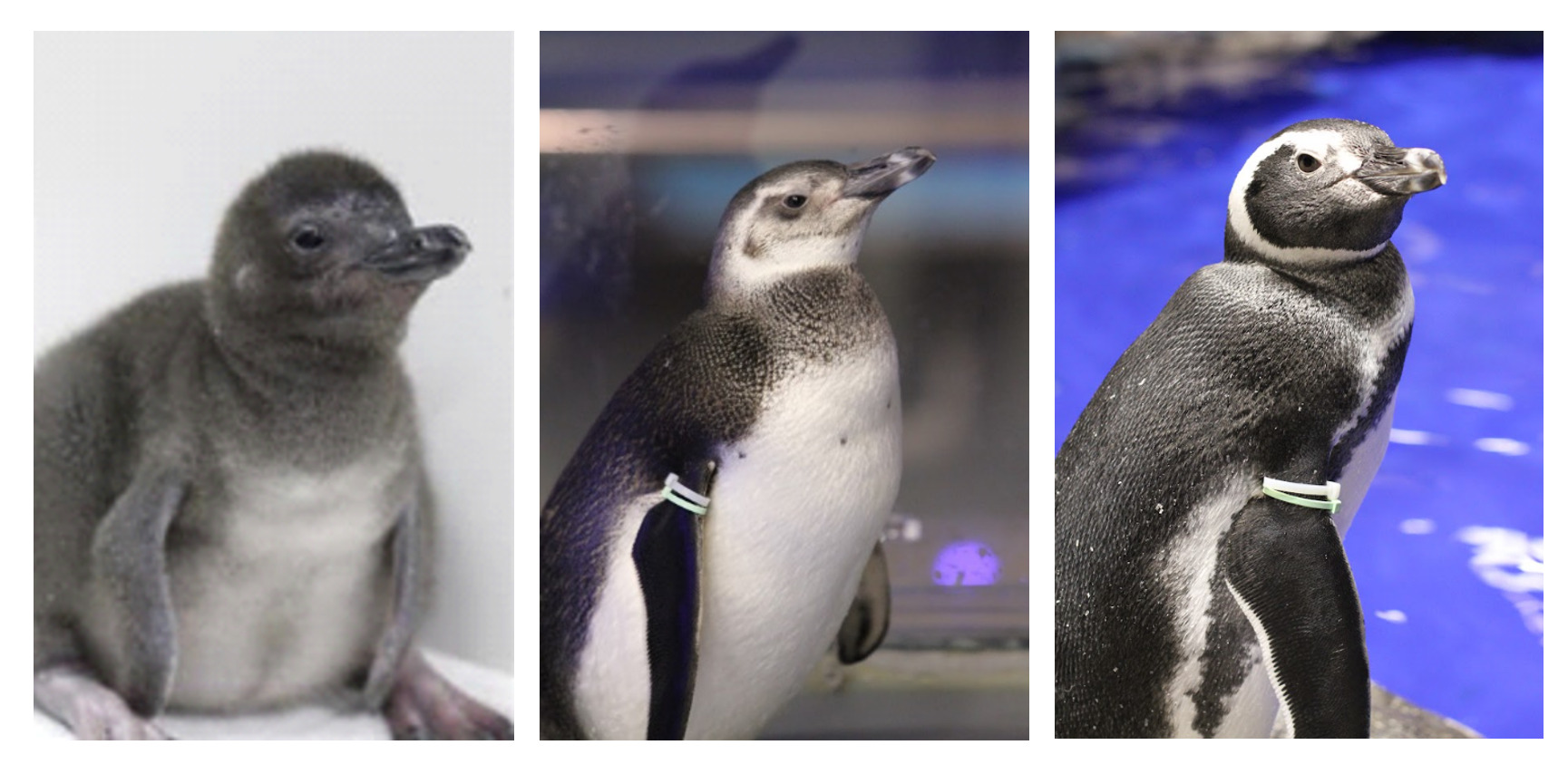 マゼランペンギンの成長<ヒナ→亜成鳥→成鳥の姿>(モデル:すみだ水族館の「はなび」)
