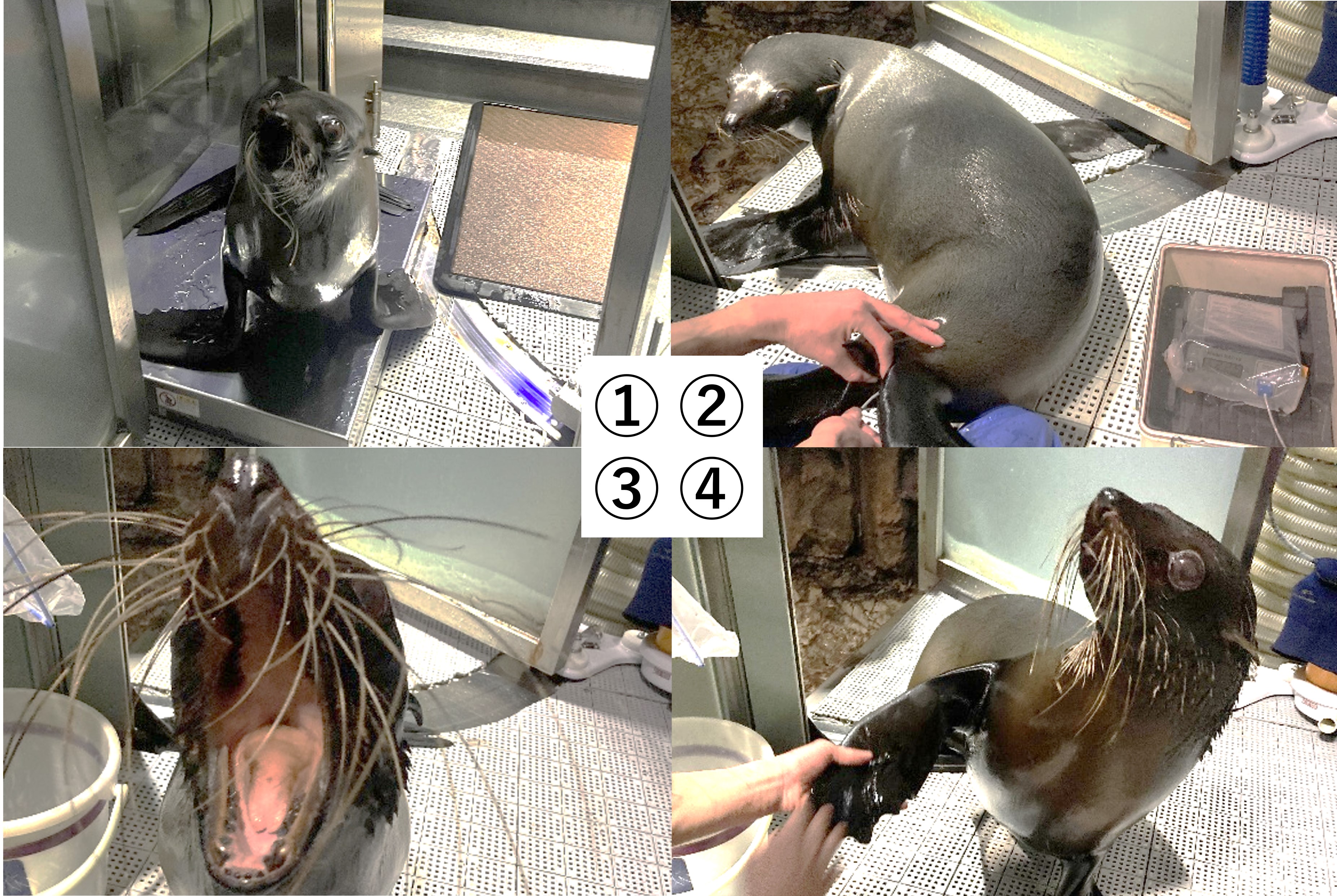 ●検温:熱がないか体温計でチェックします。確認する場所はおしりの穴。オットセイの体温は、人間とほぼ同じで36.0~37.5℃くらいです。