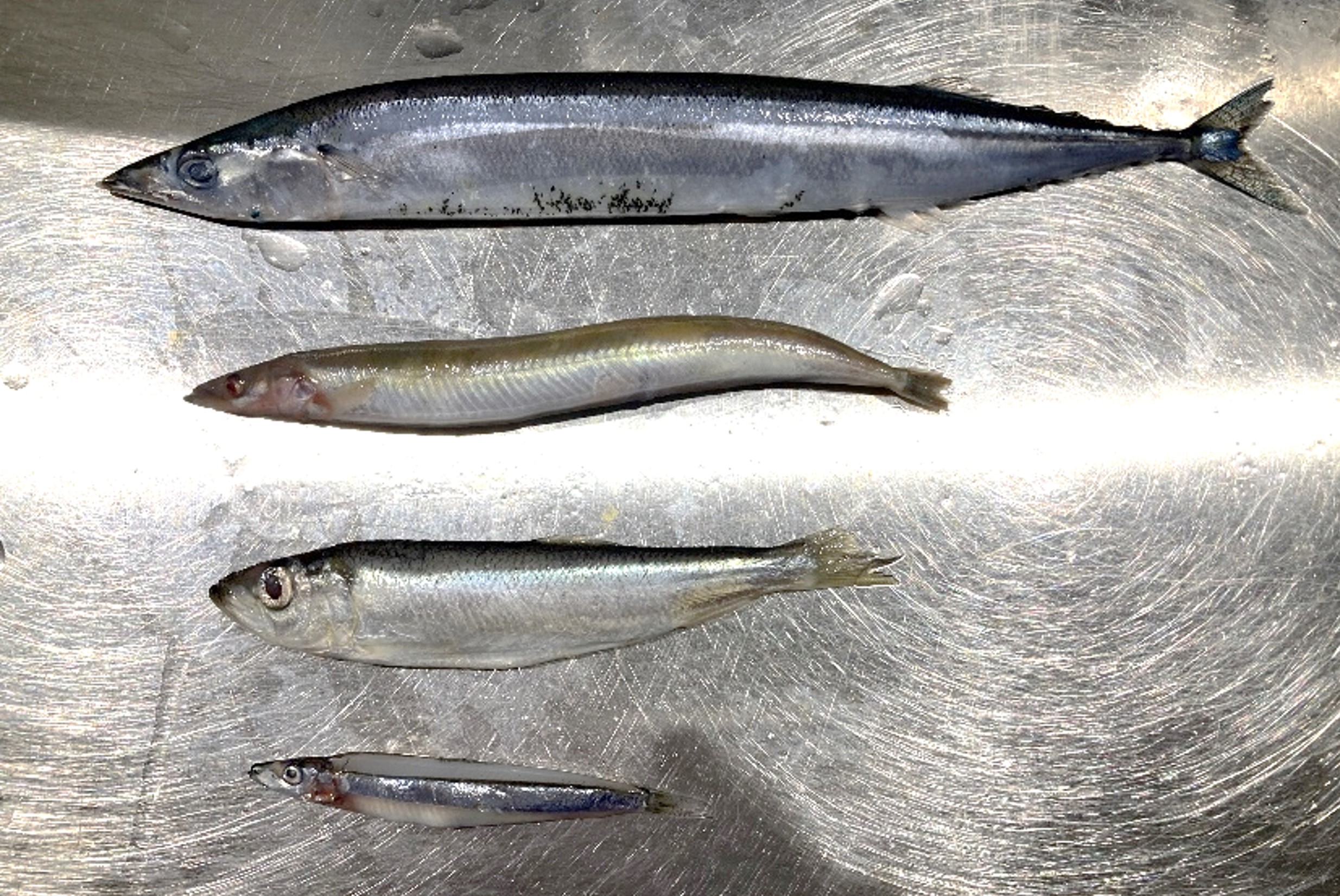 オットセイのゴハン(上からサンマ、イカナゴ、ニシン、キビナゴ)