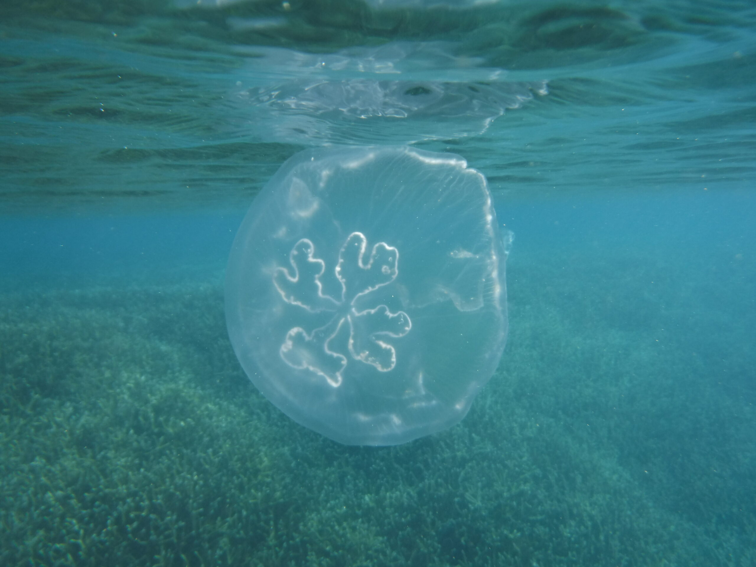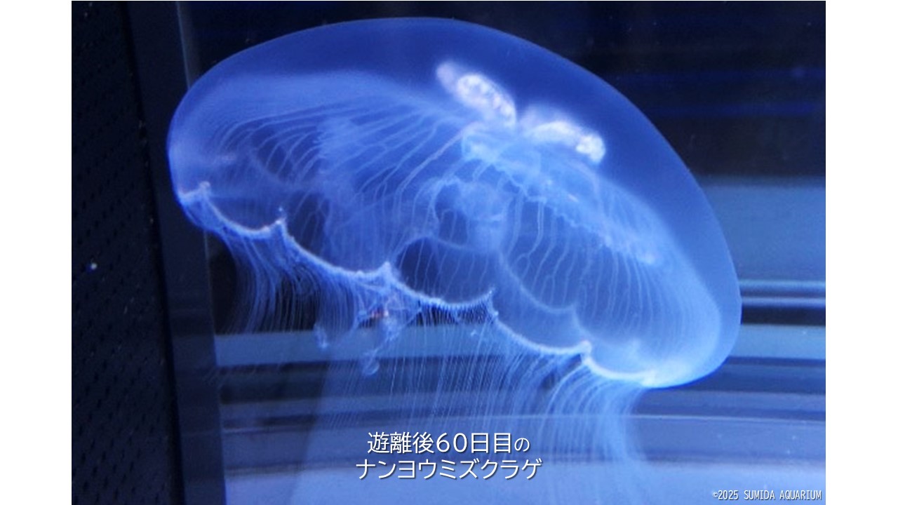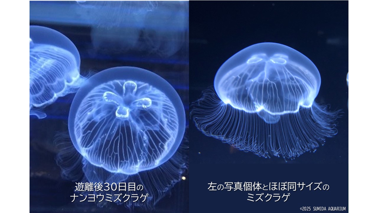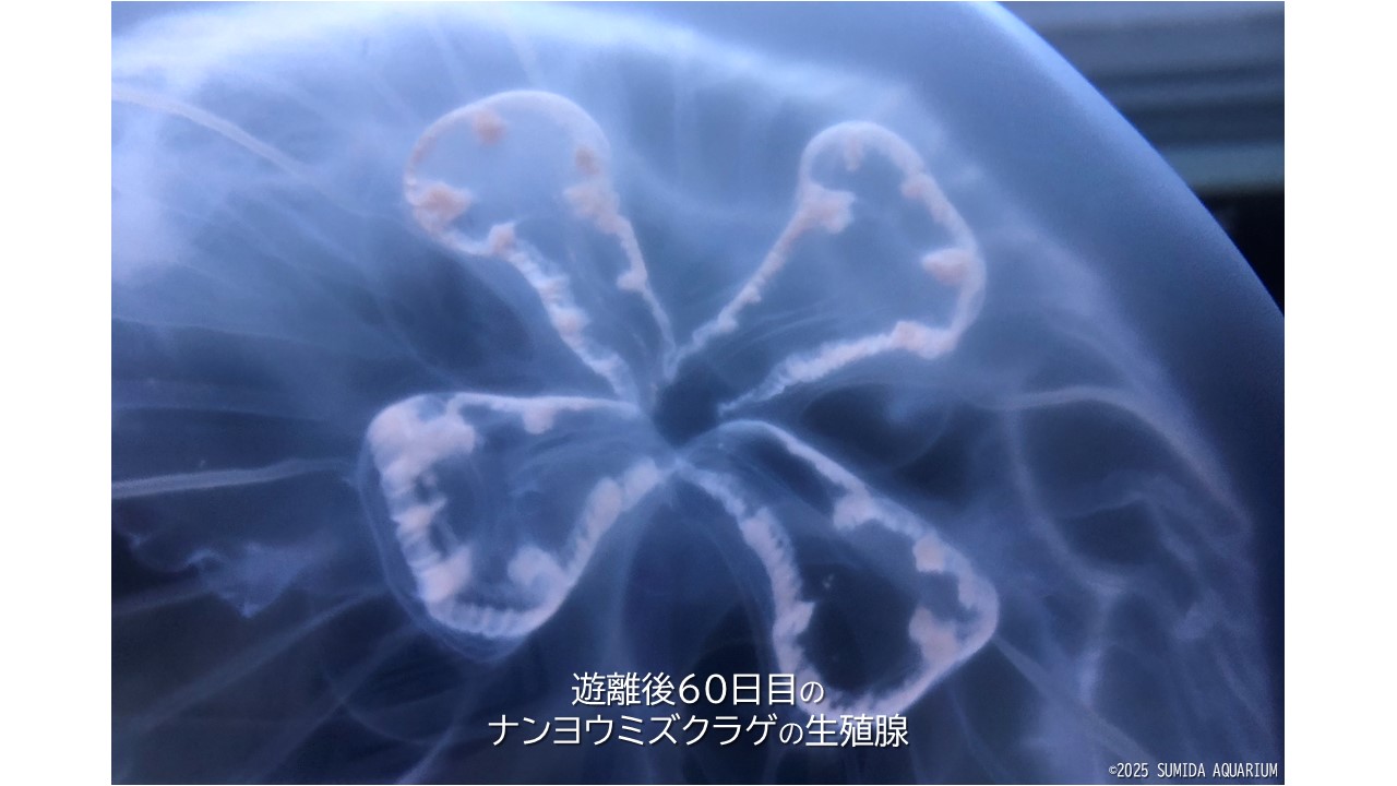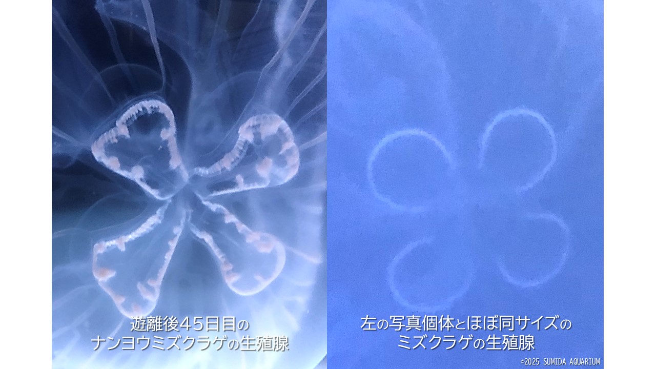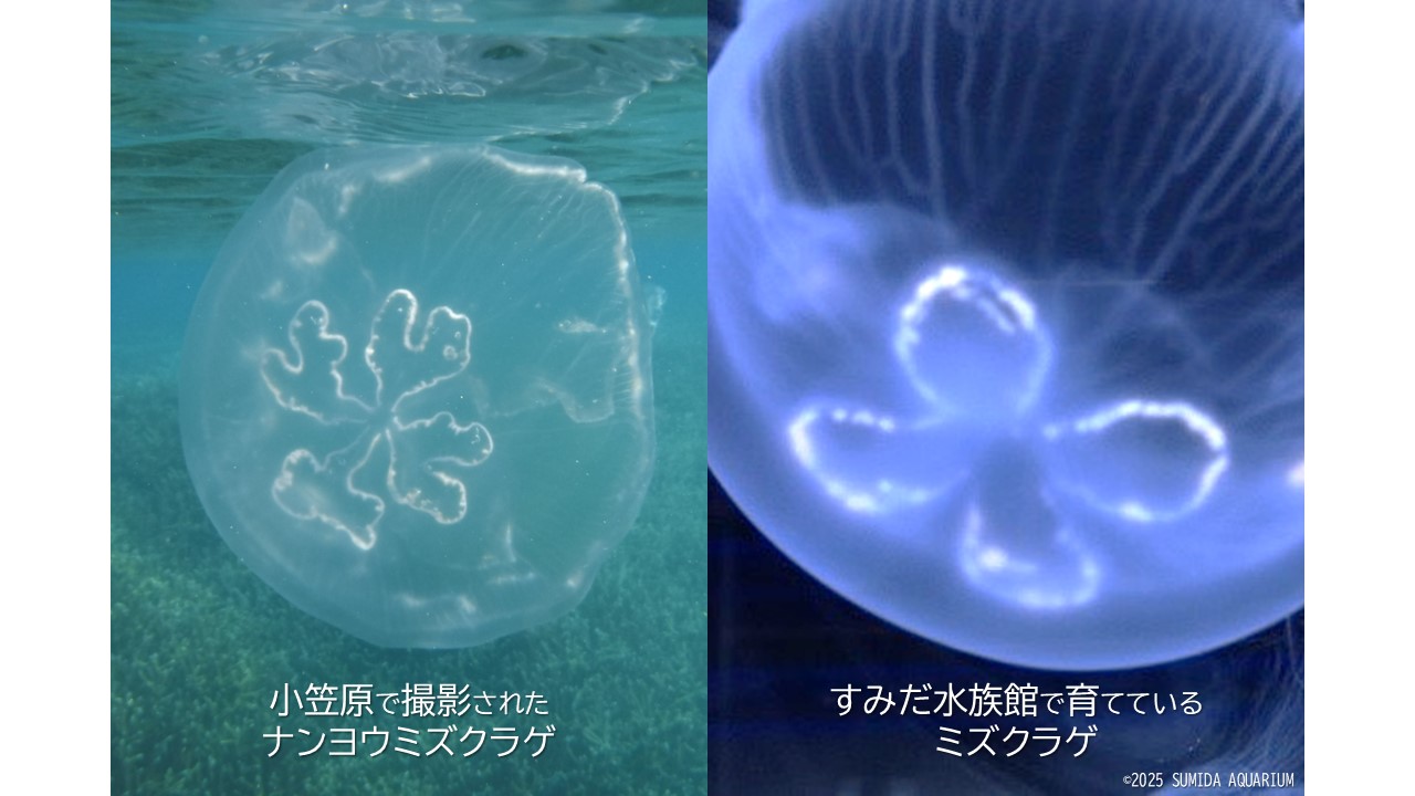 小笠原のミズクラゲと本州近海でよく見られるミズクラゲでは傘の真ん中に4つある生殖腺の形が違っていますが、過去に5cmまでクラゲを育てた時にはその違いは出ませんでした。その後、歳月が流れよく観察される本州のミズクラゲと小笠原のミズクラゲは違う種類ではないか?と研究が進み、2023年には遺伝的にも異なる種類だと分かったのです。現在はこのクラゲに「ナンヨウミズクラゲ」という新しい名前も付けられました。