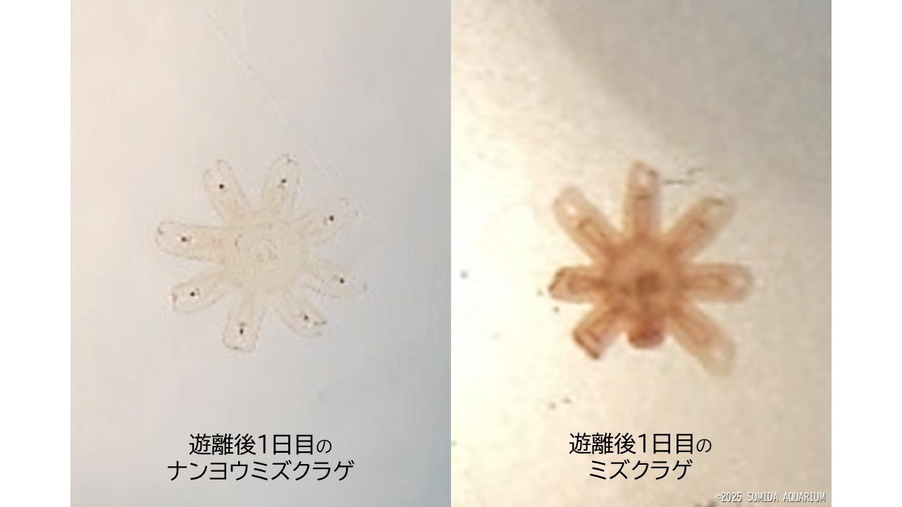 ポリプを育てているシャーレの中で遊離したエフィラを水槽へ移動して育成を開始しました。遊離したばかりのナンヨウミズクラゲのエフィラは、ミズクラゲに比べて色が薄い違いがありました。