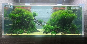 中心に据えられた天然の流木は、時を経てわずかにほっそりしましたが、これは自然物としての分解の過程です。ここに生き続ける生命(水草)と、時計の針が止まり自然の摂理を表す自然物(流木)との対比が、私たちに自然の時の流れも静かに感じさせます。