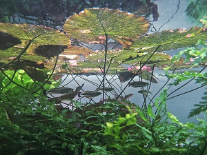 「スイレンの水辺」はご覧のとおり、スイレンの水面下の営みを再現しています。私たちの脳裏にあるスイレンは、池や鉢で花を観賞するものですが(東京であれば不忍池などが有名でしょうか)、それは陸上で暮らす私たちの視点にすぎません。水中の生物にとって、スイレンの影こそが安らぎの住まいなのです。