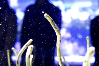チンアナゴたちのゴハンの時間をご覧いただけます。チンアナゴのゴハンタイムでは、飼育スタッフがチンアナゴの仲間たちに大小2種類の大きさのプランクトンをあげて、それぞれのゴハンの好みや食べ方の違いなどをじっくり観察することができます。流れてくるプランクトンを食べようと、チンアナゴたちが一斉に体を砂から伸ばしていくようすはゴハンの時間ならでは!時には、勢い余って砂から全身出てしまうチンアナゴを見ることができるかも!?