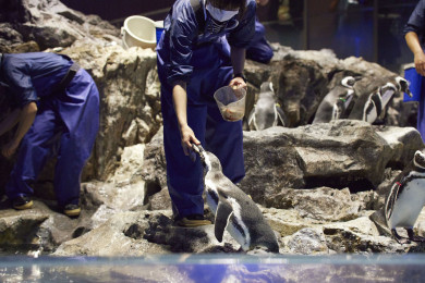 マゼランペンギンたちのゴハンの時間をご覧いただけます。ペンギンのゴハンタイムでは、飼育スタッフがペンギンたち 1 羽 1 羽に手渡しで魚をあげていき、どのペンギンがどのくらいゴハンを食べたかを確認しています。ゴハンを横取りしようとしたり、なかなかゴハンを食べられなかったりなど、ペンギンたちの個性はさまざま!全羽のペンギンがちゃんとゴハンを食べることができるようゴハンのあげ方を工夫しているようすや、ペンギンたちの情報を伝え合う飼育スタッフのチームワークもぜひご覧ください。