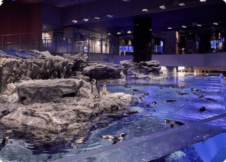 すみだ水族館では、いきものたちとの距離の近さに注目を。かわいらしいペンギンなどの表情はもちろん、いきもののゴハン準備といった飼育のウラ側も間近でご覧いただけます。