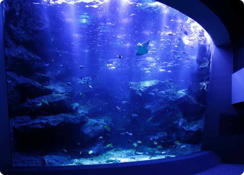 映画のスクリーンのように広がる、小笠原大水槽。小笠原諸島の海で暮らす多種多様な魚たちが、悠々と泳いでいます。