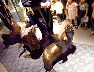 ハロウィンの仮装をして入館されたお子さまが対象で、オットセイのお面をかぶり、オットセイと一緒に館内を歩きます。