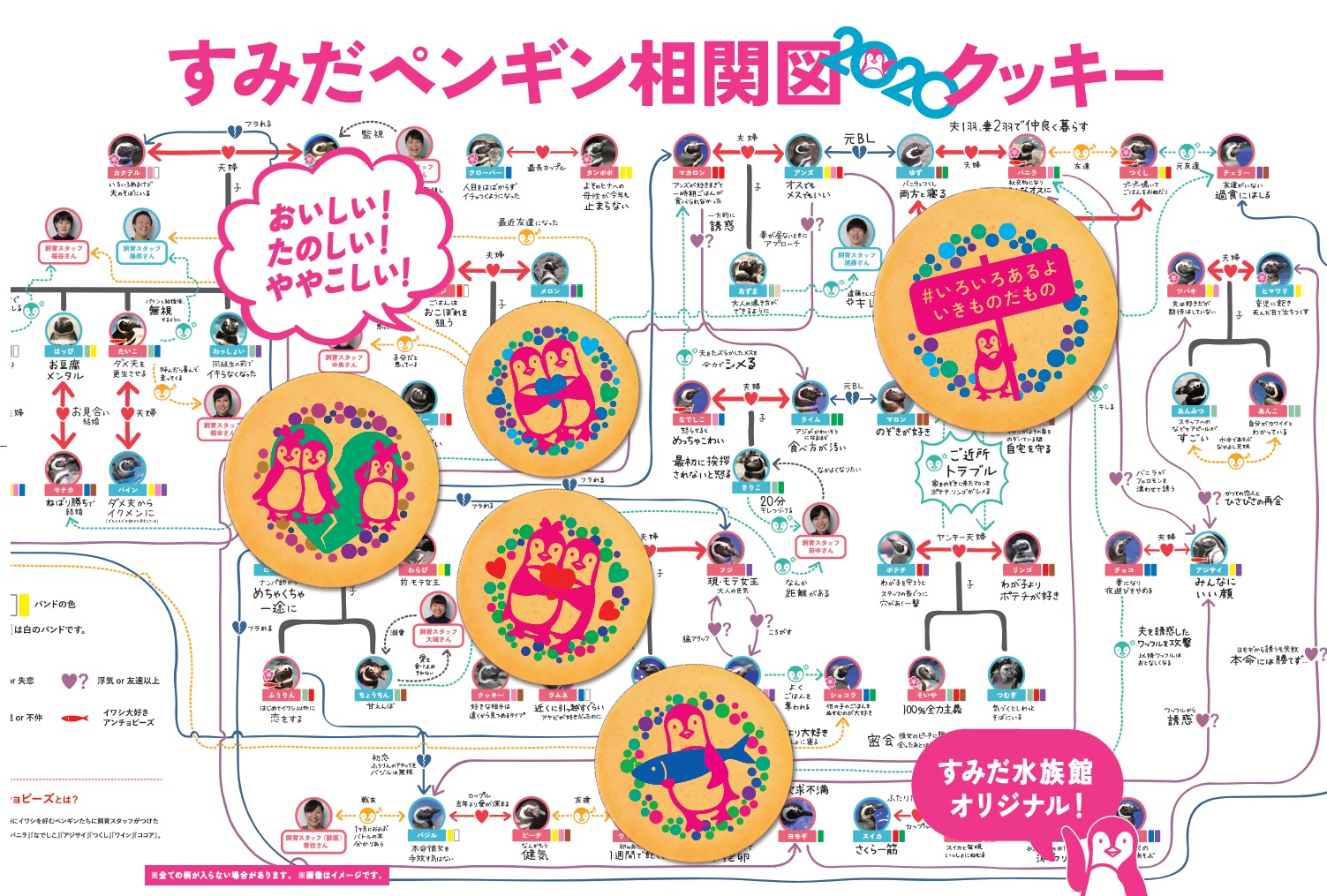 ペンギン相関図2020は、飼育スタッフがペンギンたちの日々のようすを観察し、親子や兄弟のつながりはもちろん、友人関係やカップルの変遷を最新でまとめたものです。