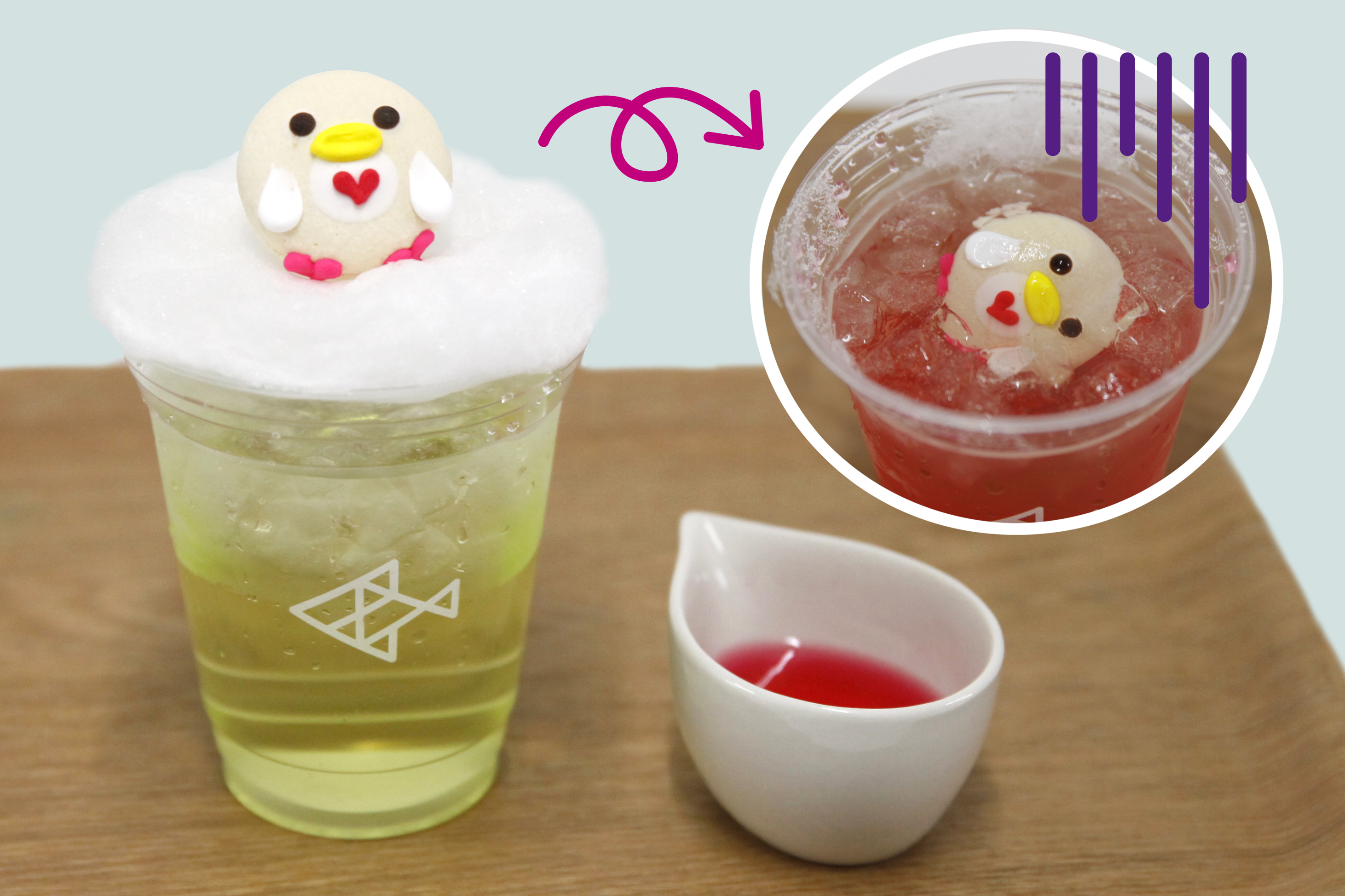 ドリンクです。「ライムをめぐりなでしこから攻撃を受けたマカロン」というペンギンのエピソードを表現しています。「なでしこ」をイメージしたいちご味のソースをかけると、マカロンが沈んでいきます。