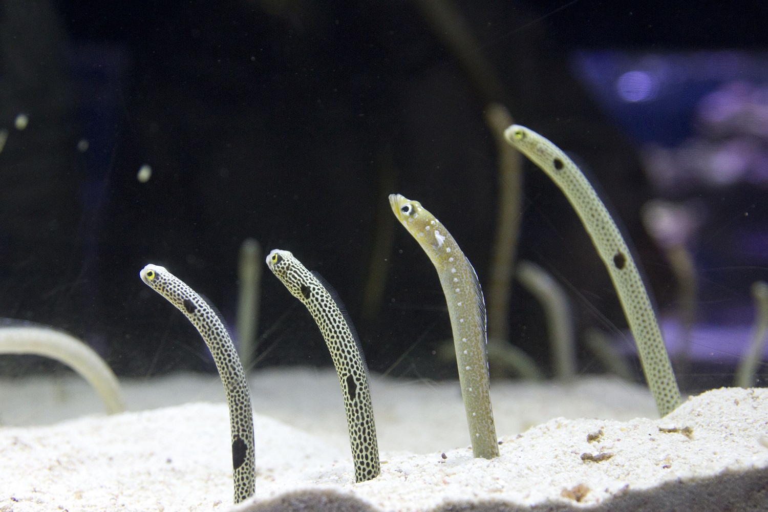 飼育スタッフがプランクトンをあげると、巣穴から一斉にチンアナゴが体を伸ばします。