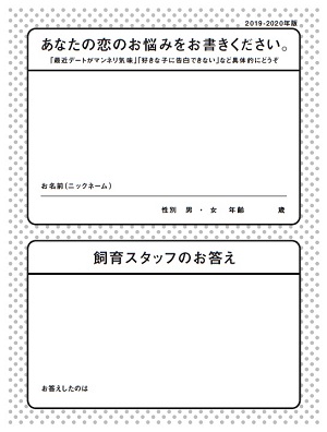 内 容:期間限定で、来館されたお客さまの恋愛を応援します。館内で募集したお客さまの恋の悩みに、水族館のスタッフならではのアイデアで答えを考えます。お悩みと回答の内容は、特設スペース内の掲示ボードでご覧いただけます。